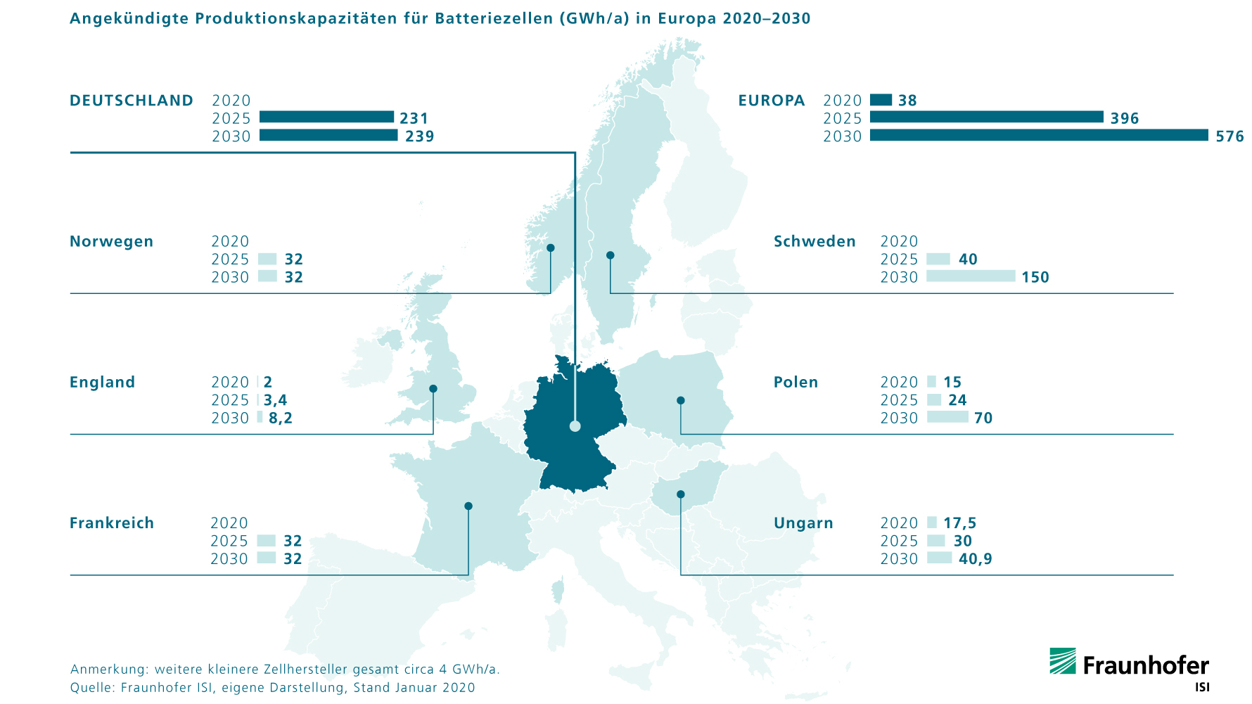 In Europa sind bis 2030 fast 600 GWh Zellproduktionskapazitäten angekündigt – die Hälfte davon soll in Deutschland entstehen. Dies entspricht einem Anteil von durchschnittlich 20% des globalen Batteriezell-Bedarfs, mit dem etwa die erwartete Nachfrage europäischer Automobilhersteller gedeckt würde.