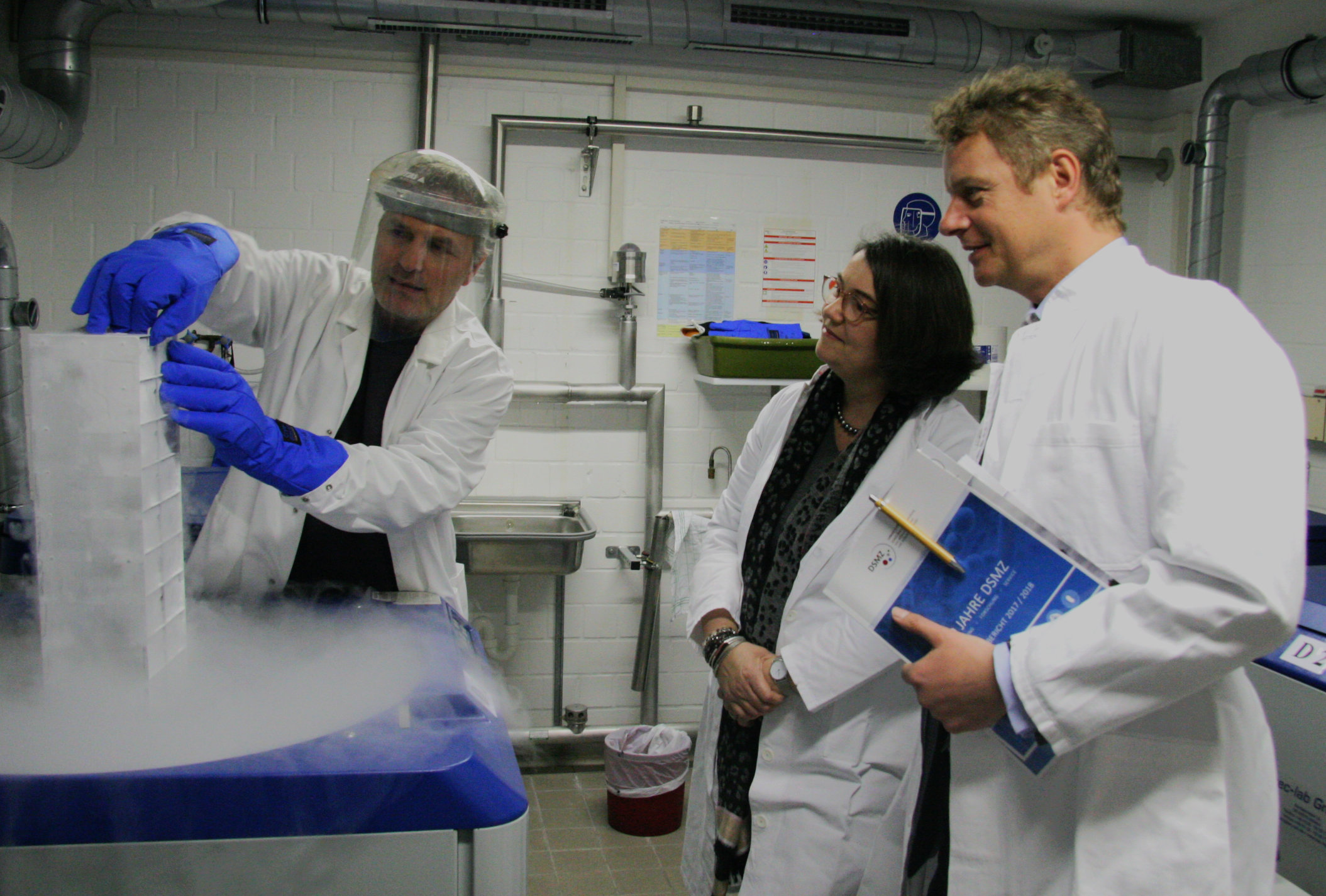 Nach der Begrüßung der Abgeordneten durch den Wissenschaftlichen Direktor Prof. Dr. Jörg Overmann und die Administrative Geschäftsführerin Bettina Fischer informierten sich die Parlamentarier über die Aufgaben und Leistungen der DSMZ, die die weltweit vielfältigste Sammlung an Bioressourcen beherbergt. Im Rahmen einer anschließenden Führung durch die Labore und Sammlungen des Hauses konnten sich die Abgeordneten mit Prof. Dr. Yvonne Mast, der Leiterin der Abteilung Bioressourcen für Bioökonomie und Gesundheitsforschung, austauschen. Beeindruckt zeigten sich die Politiker von den technologischen Möglichkeiten und zukunftsgerichteten Methoden, die die Wissenschaftler im Leibniz-Institut DSMZ entwickeln. „Der Schwerpunkt der DSMZ in Braunschweig in der Bioressourcenforschung ist von nationaler und internationaler Bedeutung. Ich habe festgestellt, dass das Leibniz-Institut DSMZ als international vielfältigste Sammlung von Bakterien, Pflanzenviren, menschlichen und tierischen Zelllinien, Pilzen und Bakteriophagen Wissenschaftlern weltweit diese Mikroorganismen und Zellen in bester Qualität zur Verfügung stellt“ resümiert MdB Jens Beeck. Über ihren Besuch der Mikroben- und Zellliniensammlung sagt Susanne Schütz: „Die DSMZ ist ein wichtiger Bestandteil der Wissenschaftslandschaft in Niedersachsen. Die Möglichkeiten der Zusammenarbeit der nichtuniversitären Forschungseinrichtungen auf dem Science Campus Braunschweig-Süd insbesondere in der Wirkstoff-, Bakteriophagen- und Infektionsforschung bietet herausragende Ansätze für viele wichtige Projekte in der nachhaltigen Lebenswissenschaft.“
