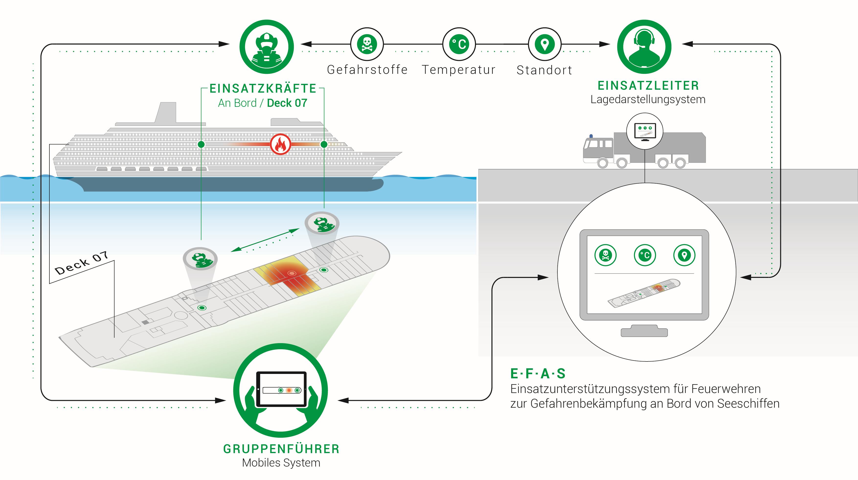 Diese Risiken zu minimieren ist das Ziel vom »Einsatzunterstützungssystem für Feuerwehren zur Gefahrenbekämpfung an Bord von Seeschiffen« (EFAS). Das Verbundprojekt wird im Themenfeld „Zivile Sicherheit– Innovative Rettungs- und Sicherheitssysteme“ im Rahmen des Programms „Forschung für die zivile Sicherheit 2012-2017“ der Bundesregierung gefördert. Nach drei Jahren Forschung haben die Projektpartner nun ein System entwickelt, das die Brandbekämpfung auch über solche Einsätze hinaus optimieren kann.