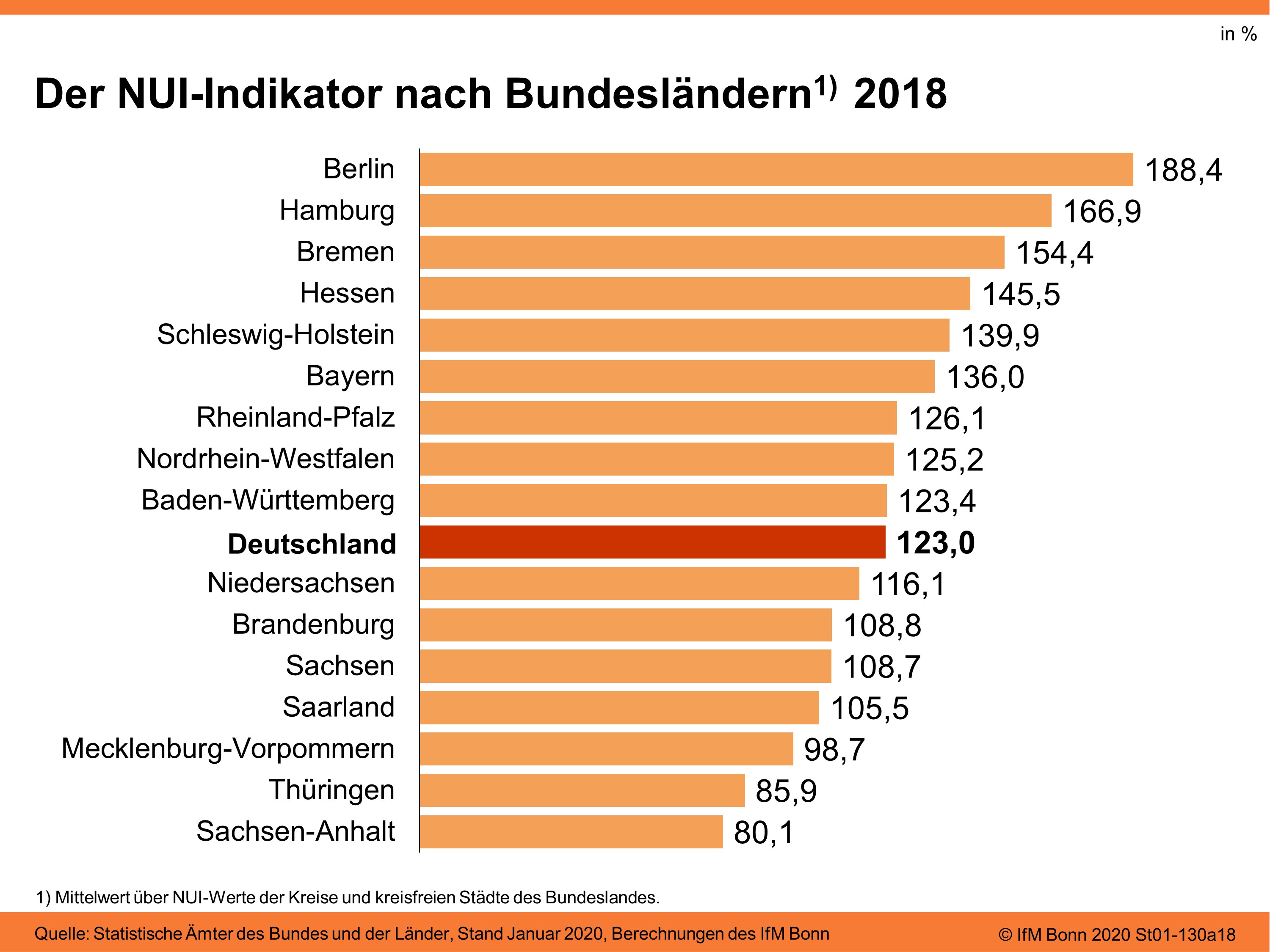 Entgegen dem weiterhin leicht negativen Trend in Deutschland (-0,9 Punkte) ist die Anzahl der neu angemeldeten Gewerbebetriebe je 10.000 Einwohner im erwerbsfähigen Alter im Saarland (+3,8 Punkte), in Brandenburg (+2,3 Punkte), Thüringen (+1,3 Punkte) und in Rheinland-Pfalz (+1,3 Punkte) geringfügig gestiegen. Die höchsten NUI-Werte unter den Bundesländern weisen jedoch weiterhin die Stadtstaaten Berlin und Hamburg auf.