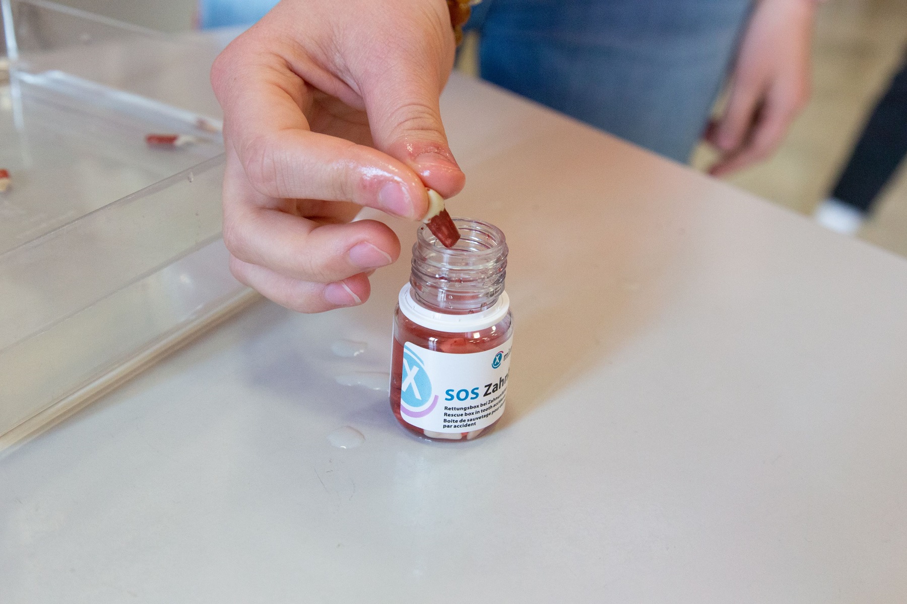 Um Sicherheit im Umgang mit den Zahnrettungsboxen zu erhalten, konnten die Mitglieder der Schulsanitätsgruppe des Gymnasiums Neutraubling im Rahmen der Übergabe gleich an künstlichen Zähnen üben. Dabei wurden den Schülerinnen und Schülern grundlegende Dinge erklärt sowie Fragen wie ‚Wo fasse ich den Zahn am besten an, ohne ihn zu zerstören?‘ und ‚Wie versorge ich den Verunfallten?‘ beantwortet. Schnelligkeit, Fingerfertigkeit und gute Augen waren gefragt, um die künstlichen Zähne zu retten. „Wichtig ist, dass man sich schnellstmöglich in zahnärztliche Behandlung begibt. Denn schon in den ersten 15 Minuten nach einem Unfall entscheidet sich, ob ein ausgeschlagener Zahn überleben kann“, so Dr. Widbiller, der die Schüler bei den Übungen fachmännisch betreute.