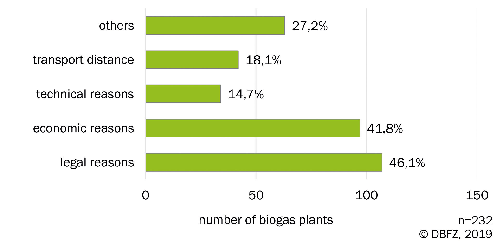 In order to bundle all collected information and results for interested users, a project website (www.dbfz.de/en/projects/china-res) was established. The German-English information portal offers information on biogas potentials, legal framework conditions of the biogas industry, animal husbandry and biogas technologies in China and Germany, respectively. In addition, best-case biogas plants such as the biogas plant Deqingyuan in Beijing, China, are presented. In parallel, a survey was conducted among German biogas plant operators and livestock farmers without an own biogas plant on the available unused substrate potentials as well as on obstacles for their energetic use. The aim of the surveys was to determine the reasons why available substrates are currently not used or will not be considered at all in the near future. Figure 1 shows that the main obstacles are of legal or economic origin.