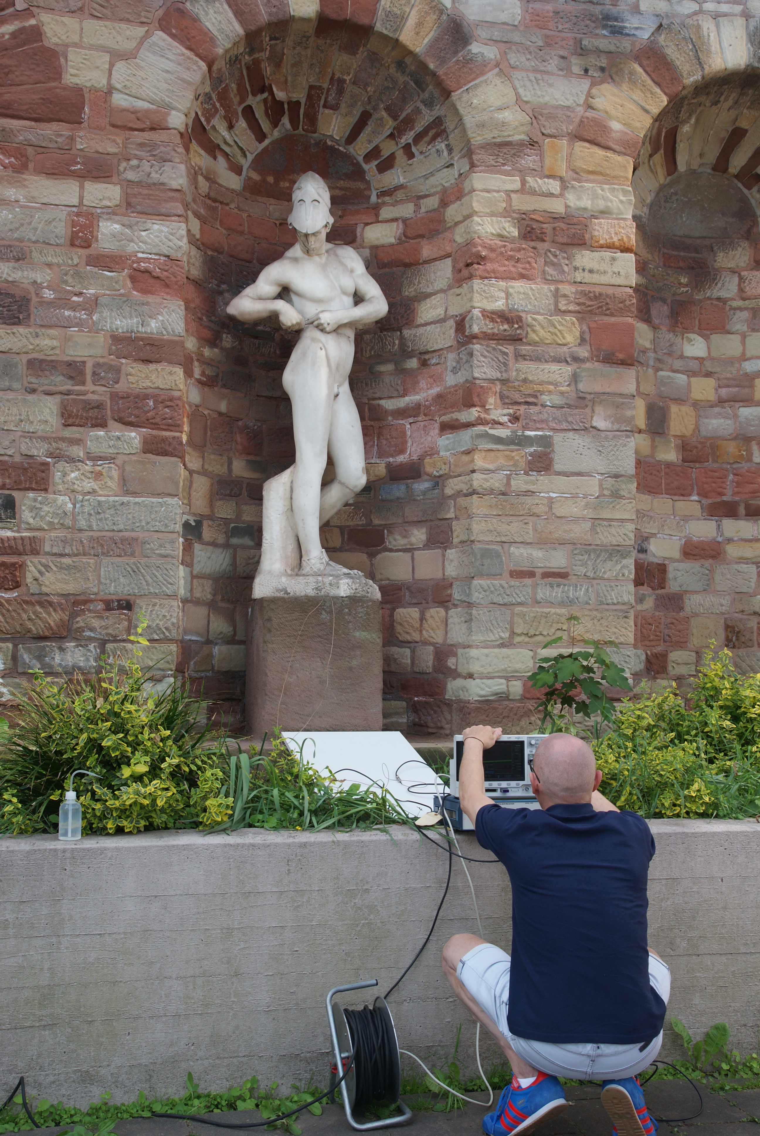 Mit der gleichen Fragestellung werden zusammen mit dem Landesdenkmalamt Saarland Messungen an historischen Gebäuden und Fragmenten antiker Bauwerke und Kunstobjekten aus Sandstein durchgeführt. Neben der Ultraschalltechnik kommt dabei auch die Terahertz-Technik zum Einsatz, mit der das Fraunhofer ITWM in Kaiserslautern arbeitet. Im Gegensatz zur Ultraschalltechnik können mit ihr Objekte berührungslos durchstrahlt werden. Beide Methoden liefern dabei komplementäre Informationen über den Zustand und die innere Struktur der untersuchten Objekte. Ergänzt werden die beiden Technologien durch die 3D-Oberflächenerfassung mit der Fotogrammetrie und Strukturiertem Licht, sodass ein sogenannter »digitaler Zwilling« des Objekts entsteht, der den aktuellen Zustand dokumentiert und für vergleichende, zukünftige Untersuchungen genutzt werden kann.