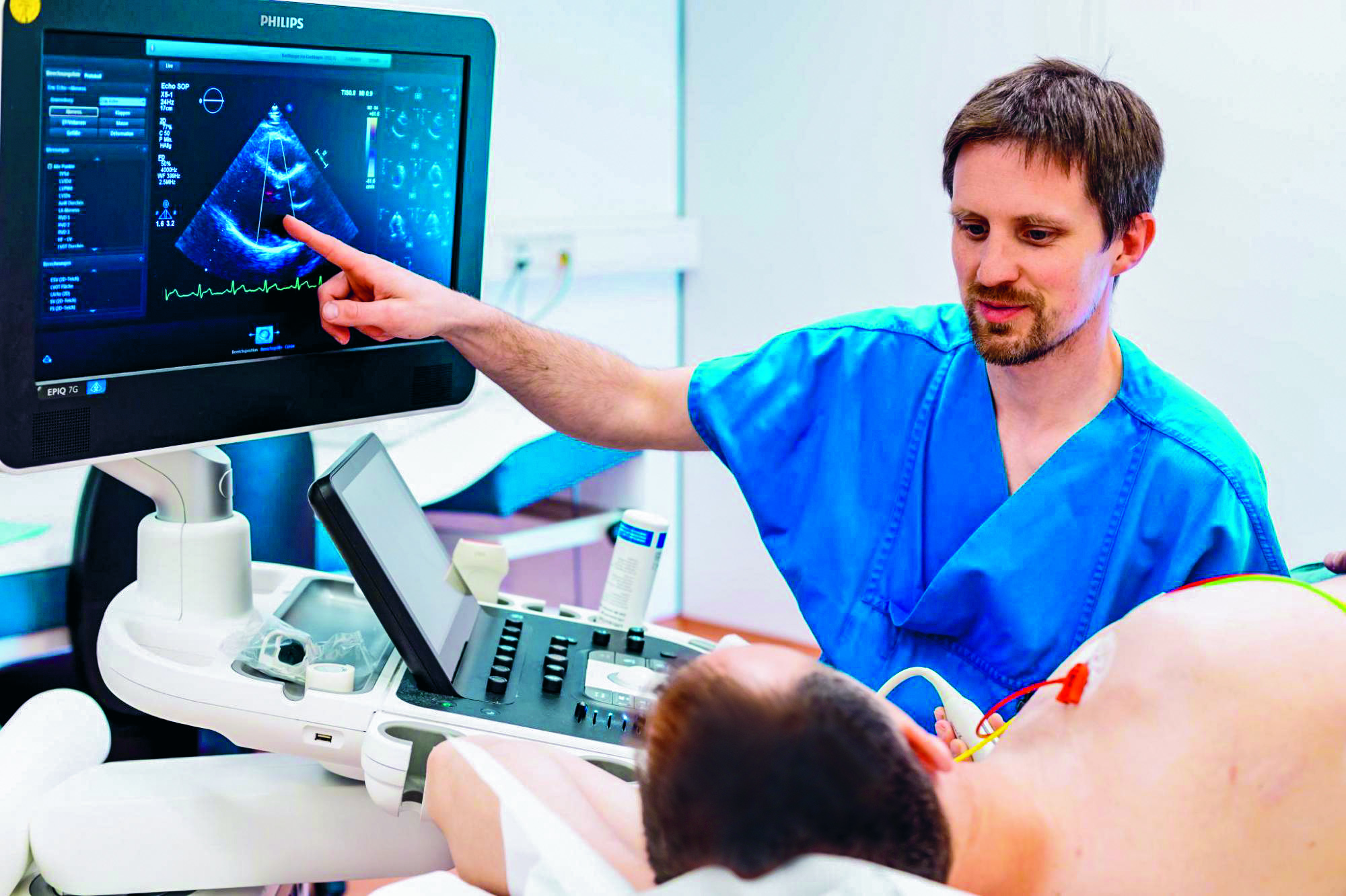 Der forschende Kardiologe Professor Karl Toischer während einer Herz-Ultraschalluntersuchung am Herzzentrum der Universitätsmedizin Göttingen.