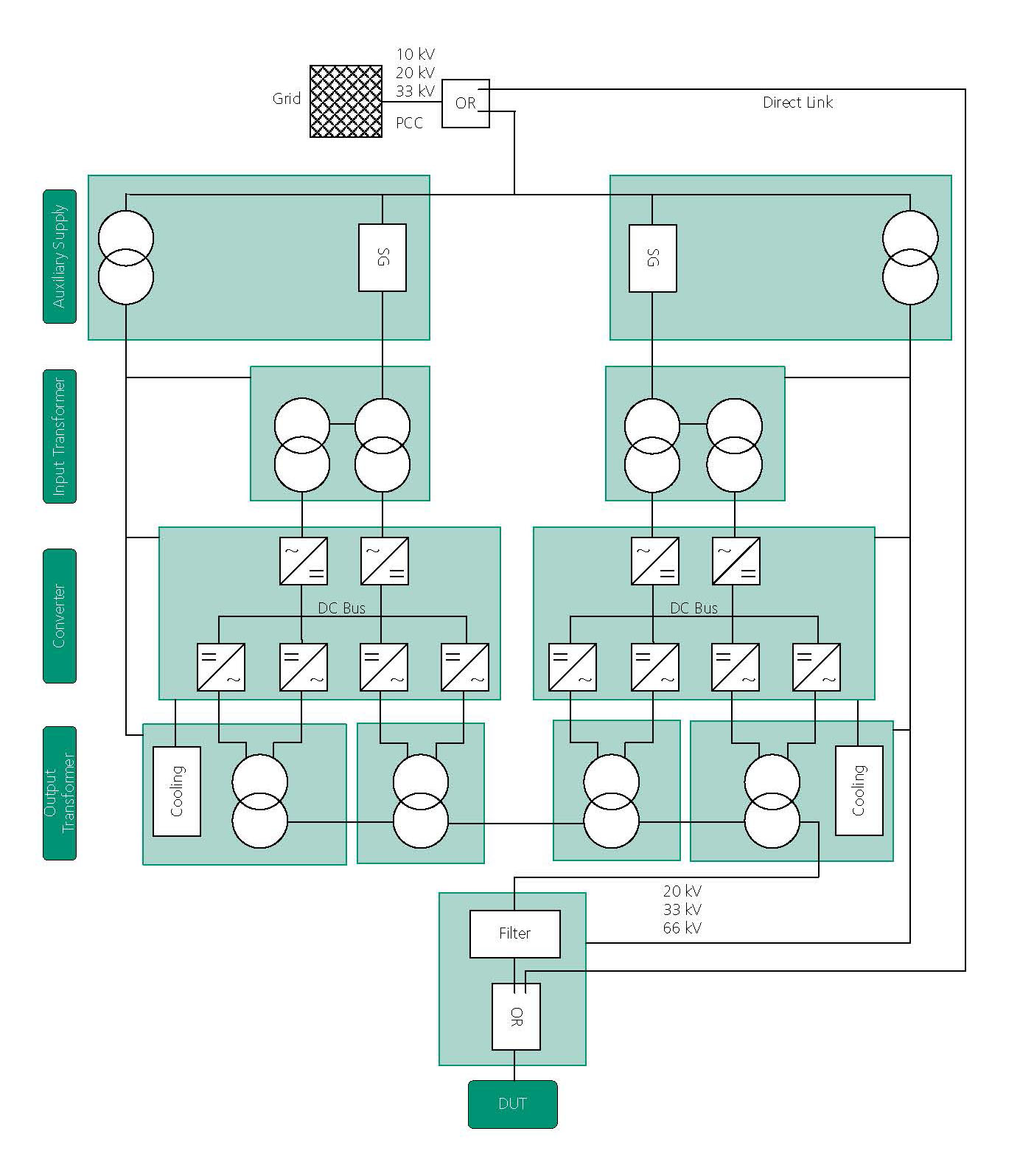Within the scope of the restructuring of the power grid, renewable energies are increasingly being included in system services and the requirements placed on the electrical properties of generating plants for connection to the grid are growing steadily. Test benches are currently available for accelerated testing of the electrical properties of wind turbines, enabling realistic testing under reproducible conditions in a defined time frame. However, future turbine sizes, especially offshore, demand an output in excess of 15 MW, which cannot be provided by today’s test benches.