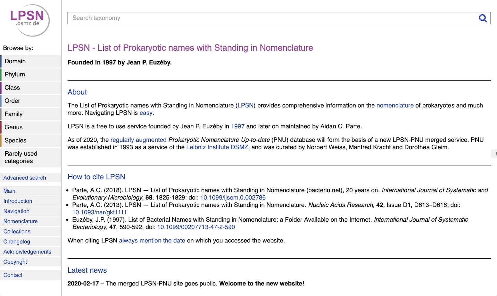 Since there was considerable overlap between the goals and the content of LPSN and PNU, it was a natural progression for the two services to become one, taking advantage of the higher profile of LPSN and the superior technology that forms the backbone of PNU. In 2019, Aidan Parte and DSMZ agreed to merge the two databases and integrate them into DSMZ’s infrastructure. After integrating all data at the level of individual taxon names, a new LPSN website (https://lpsn.dsmz.de) was created with particular emphasis on easy access to comprehensive and up-to-date information on microbial nomenclature.