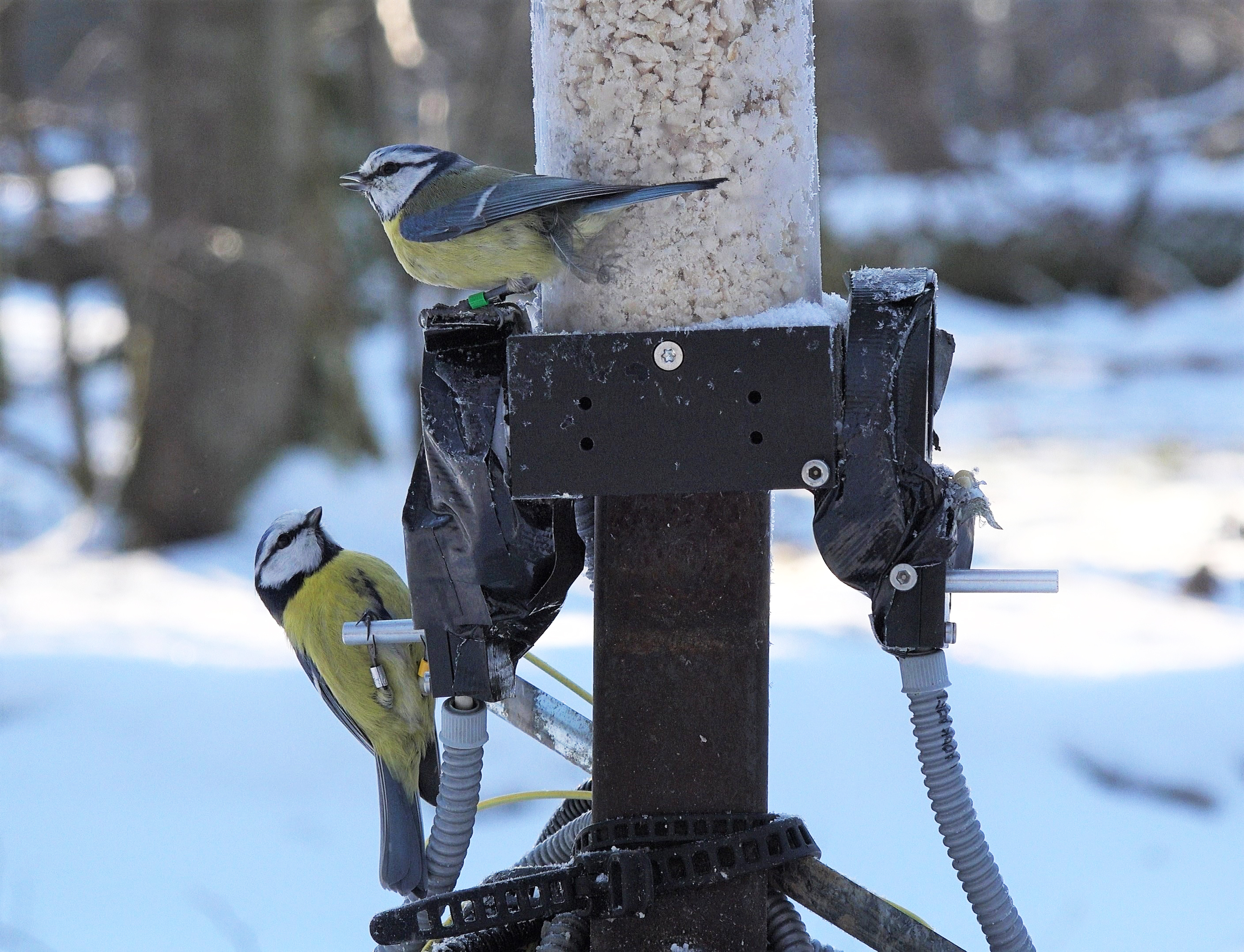 The researchers quantified the birds’ social associations during foraging events at local bird feeders and while visiting nest-boxes during winter. To obtain these data, they installed a self-designed, custom-built automated monitoring system including 20 feeders and 277 nest-boxes in their forest study site in Southern Germany. Blue tits in the study area carried a tiny “Passive Integrated Transponder” (PIT-tag) with an individual code activated externally by the scanning device in the feeder or nest-box. With this setup, the researchers could record the date, time, and identity of every PIT-tagged blue tit visiting. Using these data the researchers created a social network that visualizes who hangs out with whom and how often.