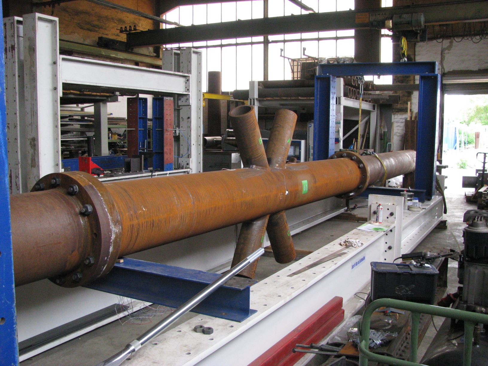 Die Ausmaße der Versuchsanordnung sind immens: Stahlrohre von 18 Metern Länge mit einem Stahlknoten in der Mitte hängen in einer Konstruktion, welche die 15 Tonnen schweren Bauteile in Schwingung bringt. So wird die Belastung des Verkehrs für die Brückenkonstruktion simuliert. Zeigt sich unter der dynamischen Belastung ein Riss, wird seine Ausbreitung beobachtet und vermessen, bis das ganze Rohr durchbricht. Dieser so genannte Großbauteilversuch der Hochschule München in einem Labor in Kissing bei Augsburg soll Aufschluss darüber geben, inwiefern sich die Ergebnisse kleinformatiger Versuchsanordnungen hochrechnen lassen: „Wie verhalten sich geschweißte Knotenverbindungen von Fachwerkbrücken in großen Dimensionen, wenn ich etwas schlankere Rohre mit größeren Blechdicken verwende?“, lautete die Forschungsfrage von Prof. Dr. André Dürr, Professor für Stahlbau und Baustatik an der Hochschule München (HM).