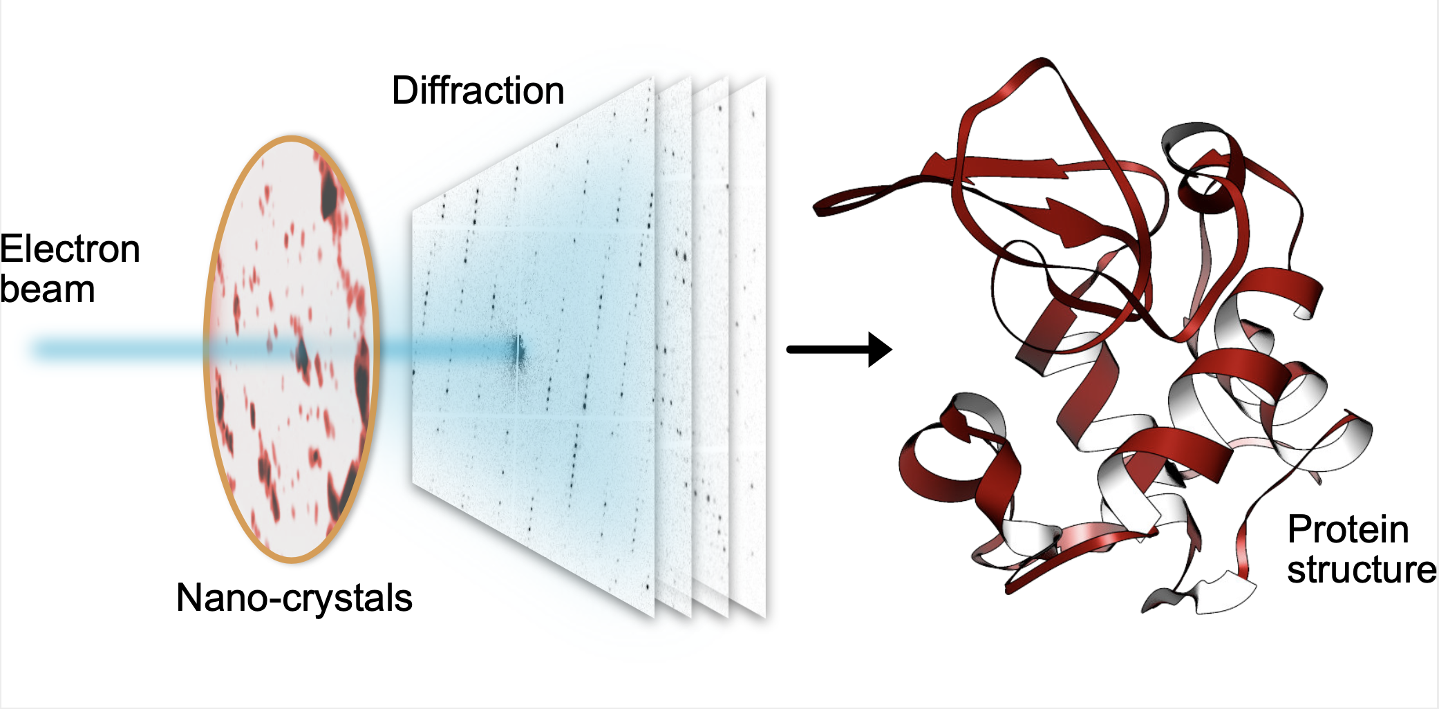 Statt ein Milliarden-Euro-Großforschungsinstrument wie den EuXFEL einzusetzen, verteilten sie diese Kristalle einfach auf einem dünnen Kohlefilm und legten sie in ein Elektronenmikroskop, wie es in vielen Laboren vorhanden ist. Der Elektronenstrahl wird dazu gebracht, von einem Nanokristall zum nächsten zu hüpfen, um Beugungsdaten zu sammeln. Die Nutzung von Nanokristallen reduziert nicht nur die benötigte Menge der oft seltenen und teuren Proben, sondern erspart den Forschern zudem das Züchten großer Proteinkristalle, wie bei konventionellen Röntgenmethoden – oftmals eine extrem schwierige Aufgabe.