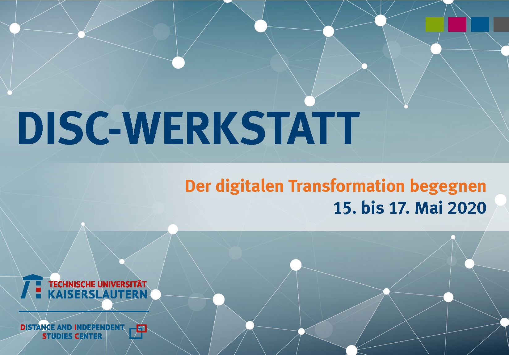 Mit welchen Strategien kann man dem digitalen Wandel in der Arbeitswelt begegnen? Darum geht es bei der „DISC Werkstatt – Der digitalen Transformation begegnen“. Sie findet vom 15. bis 17. Mai in Kaiserslautern statt. Organisiert wir die Veranstaltung vom Distance and Independent Studies Center (DISC), dem Fernstudienzentrum der Technischen Universität Kaiserslautern. Auf dem Programm stehen verschiedene Seminare zu Themen wie neue Managementkonzepte und rechtliche Rahmenbedingungen. Die Gebühren belaufen sich auf 265 Euro. Das Angebot richtet sich an Studierende, Alumni und alle, die Interesse daran haben. Eine Anmeldung ist noch bis zum 20. April möglich.