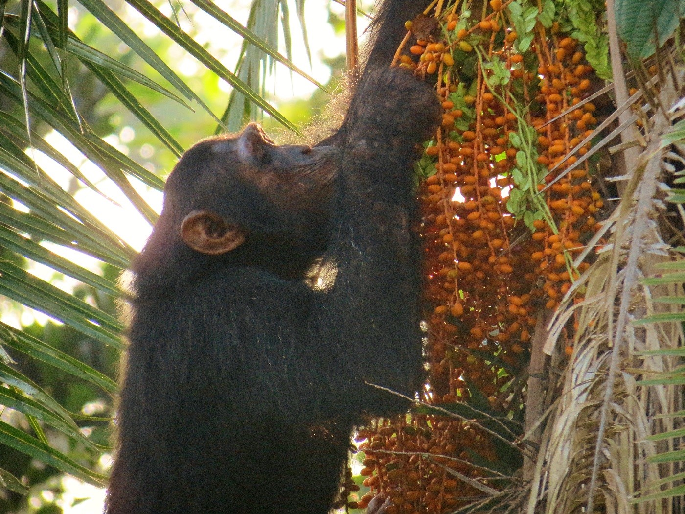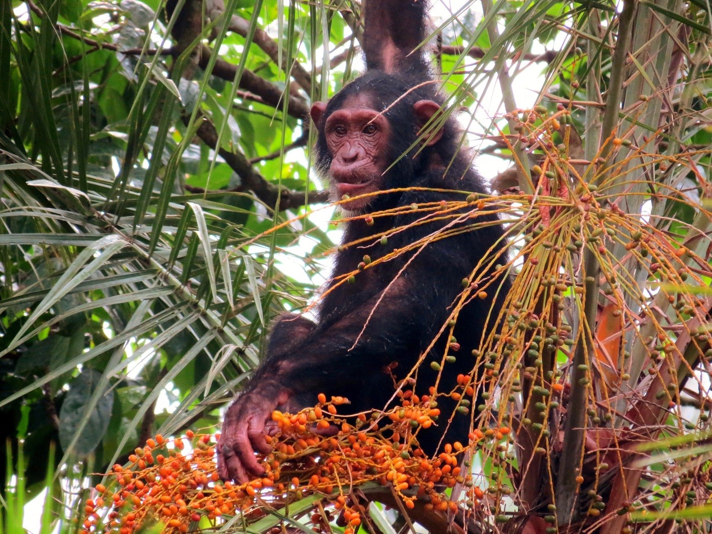This relationship is a win-win situation, benefiting both primates and palms: while primates rely on palm fruits as their primary food source, they are also important seed dispersers in tropical forests, particularly for large fruits. The research shows that the number of diurnal, fruit-eating primates in Africa increases with the proportion of conspicuous palm fruits, with a peak in subtropical regions. The results suggest that the effects of palm fruits on primates are strongest in the transition zones of arid to subtropical regions, where competition for food is also high. For the African primates, the ability to see several colours is thus an advantage when foraging. Palms, in turn, evolved colourful fruits that could be easily spotted by the primates, thus helping to disperse their seed.