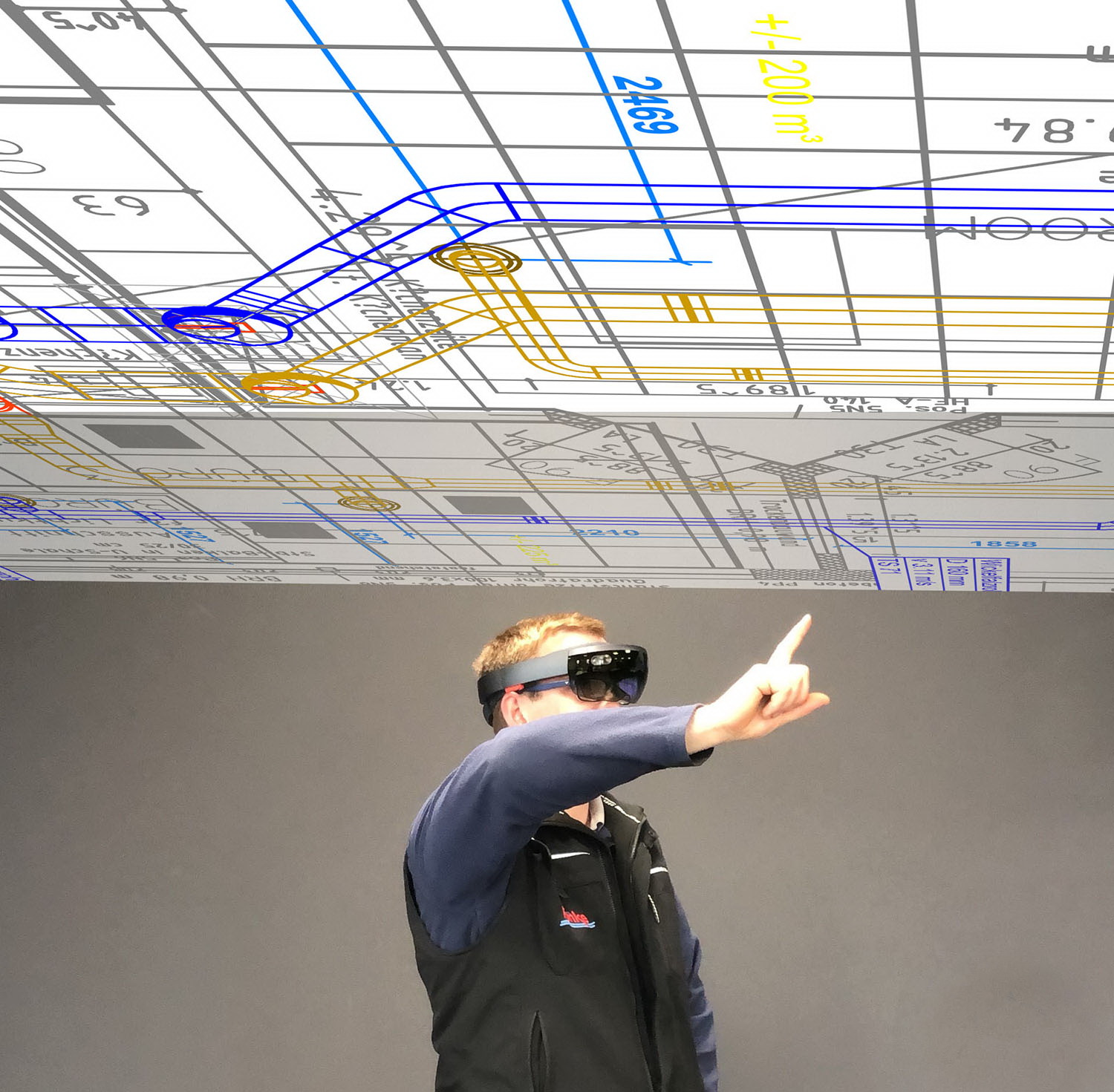Mit dem System lassen sich 2D-CAD-Daten über die AR-Technik direkt auf die Baustelle bringen. CAD ist die Abkürzung für computer-aided design (rechnerunterstütztes Entwerfen). „Über eine AR-Brille bekommt der Mitarbeiter alle Schächte, Auslässe und Einbauten aus dem CAD-System deckungsgleich und maßstäblichauf die Decke oder den Fußboden projiziert“, erklärt AnyMotion-Geschäftsführer Frank Bischoff. Das Assistenzsystem kann die Daten direkt aus dem Konstruktionsprogramm AutoCAD einlesen. Sie können dann auf der Baustelle korrigiert und ergänzt sowie anschießend wieder in das AutoCAD-System zurückgeladen werden. „So wird das Ausmessen überflüssig und Überragungsfehler sind ausgeschlossen.“