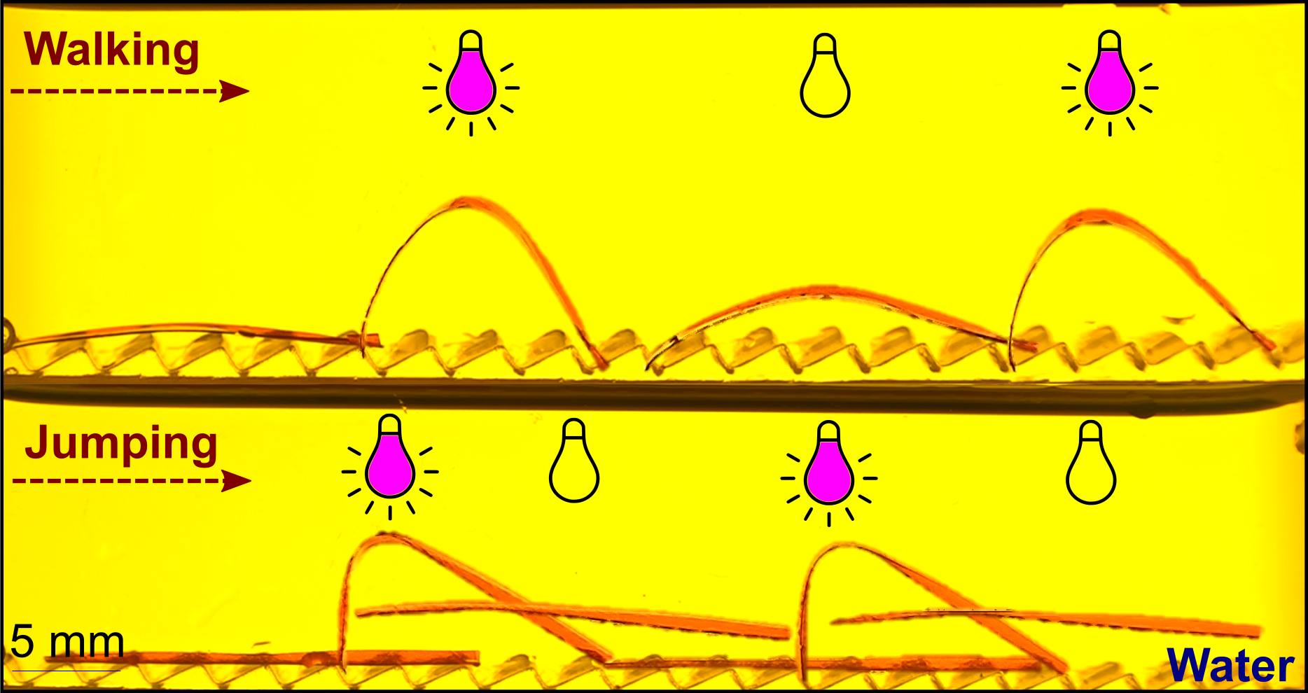 Der zweite Vorteil besteht darin, dass durch die Anordnung der Gelmoleküle in einem bestimmten Muster die Gesamtkonstruktion von nur wenigen Millimetern ihre Form verändern kann, wenn Licht bestimmte Teile des Roboters beleuchtet (wegen dieser gezielten Ausrichtung der Gelmoleküle sprechen die Forscher von „programmierbarer Formveränderung"). Sobald das lichtempfindliche, schlaffe, gummibandähnliche Material Licht ausgesetzt wird, kann es schnelle und reversible Formveränderungen durchführen: es kann kriechen, laufen, springen und schwimmen. Das liegt daran, dass LCGs ihre Dichte bei Lichteinwirkung um 7-8% reduzieren. Durch Licht werden die einzelnen LCGs also leichter und schwimmen nach oben. Durch den Auftrieb der beleuchteten Teile und durch das Ein- und Ausschalten des Lichts in bestimmten Zeitabständen wird der Roboter photothermisch betätigt (siehe Abbildung 1 und Video).