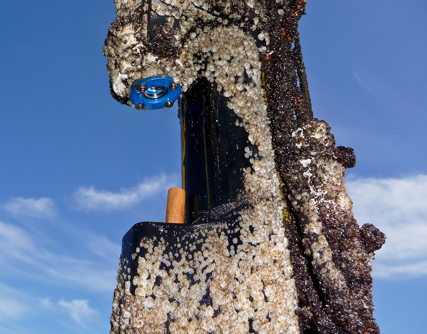 "A decisive factor for ensuring the consistently high quality of underwater measurements in long-term operation is the efficient control of biofouling," says Robert Mars. The IOW instrumentation expert is in charge of the technical support of the Baltic Sea MARNET stations and is the inventor of the new antifouling UV spotlight. "Organisms that colonise probes have a considerable effect on the sensory equipment, for example by hindering the oncoming flow of water, altering the measuring environment in the close vicinity of the probes, weakening their sensitivity and much more. For example, without antifouling, it takes only two to four weeks - depending on the season - until algae growth massively falsifies the measurement of chlorophyll-a-fluorescence," Mars explains the problem. However, since the measuring stations can be serviced by ship only five or six times a year, chemical antifouling or not very effective mechanical aids have so far been necessary. "Especially since the tributyltin compounds (TBT), a highly toxic antifouling agent, were banned EU-wide in 2008, fouling has become a chronic problem in underwater measurement technology", says the IOW engineer.