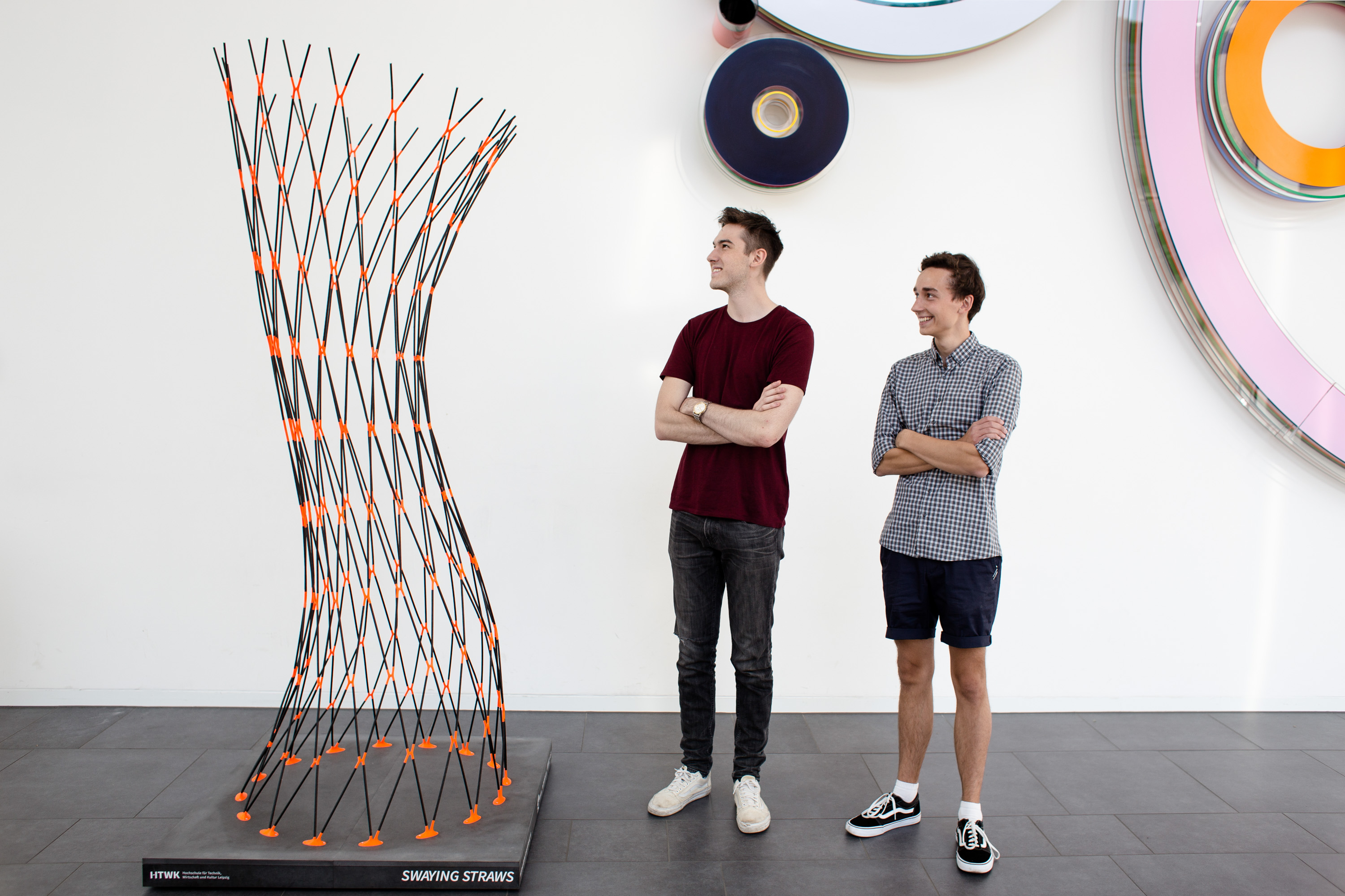 Hier haben Fabian Eidner (21) und Theodor Reinhardt (21) sechs Monate lang neben dem Studium an ihrer Idee gearbeitet. Erstmalig präsentiert wurde Swaying Straws bei den Messen „Rapid.Tech + FabCon 3.D“ in Erfurt und „Designers’ Open“ in Leipzig. Im Januar 2020 erhielten die beiden Studenten eine Anerkennung beim Bremmer-Preis, einer jährlich verliehenen Auszeichnung für die besten Entwurfsarbeiten von Architekturstudierenden der HTWK Leipzig. Vor wenigen Tagen haben Eidner und Reinhardt ihr Bachelorstudium mit großem Erfolg abgeschlossen. Ab März arbeiten beide als Nachwuchswissenschaftler in der Forschungsgruppe FLEX daran, ihre Konzeptstudie in die Anwendbarkeit zu überführen. Der nächste Schritt: das Verbindungselement aus Metall statt aus Kunststoff fertigen.