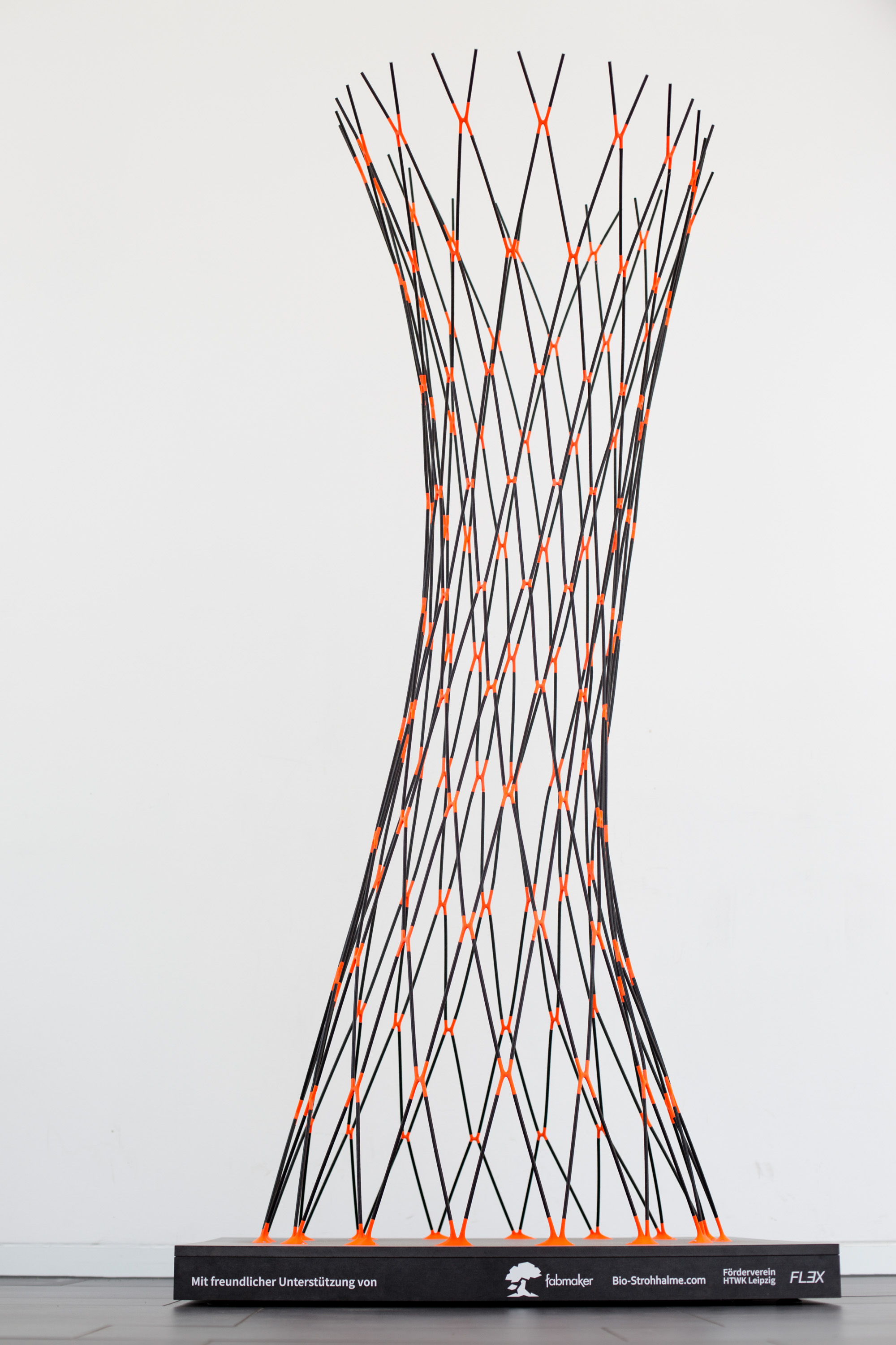 Swaying Straws (Wiegende Halme) heißt die Skulptur, die die zwei Architekturstudenten Fabian Eidner und Theodor Reinhardt von der Hochschule für Technik, Wirtschaft und Kultur Leipzig (HTWK Leipzig) bei der Sonderschau Talente zur Internationalen Handwerksmesse vom 11. bis 15. März 2020 in München (Messegelände, Halle B1) präsentieren. Insgesamt 320 schwarze Papierstrohhalme und 160 orangene Verbindungselemente aus Kunststoff bilden ein säulenförmiges Netz, das sich im Wind zu wiegen scheint. Dahinter steckt eine neue Konstruktionsidee für organisch gekrümmte Gebäudefassaden.