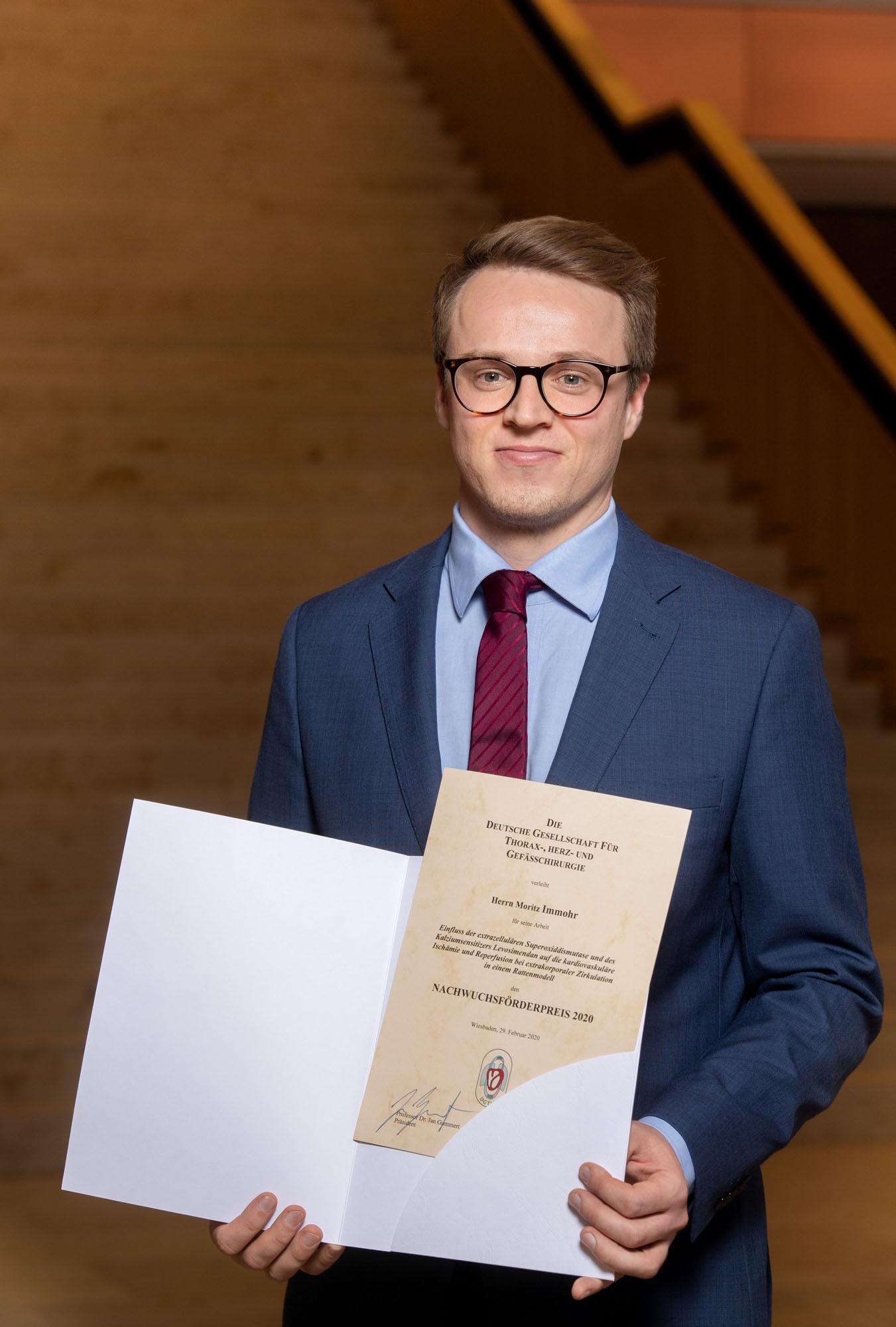 Den Nachwuchsförderpreis der DGTHG erhielt 2020 Dr. med. Moritz Benjamin Immohr, Herzchirurgische Klinik der Universität Düsseldorf, für seine Arbeit “Einfluss der extrazellulären Superoxiddismutase und des Kalziumsensitizers Levosimendan auf die kardiovaskuläre Ischämie und Reperfusion bei extrakorporaler Zirkulation in einem Rattenmodell“. Mit dem Nachwuchsförderpreis, der mit 2.500 Euro dotiert ist, werden jährlich experimentelle und klinisch relevante Promotionsarbeiten aus dem gesamten Bereich der Thorax-, Herz- und Gefäßchirurgie ausgezeichnet. Im Rahmen der feierlichen Eröffnung der Jahrestagung wurde der Preis durch den DGTHG-Sekretär Prof. Dr. Andreas Markewitz übergeben.