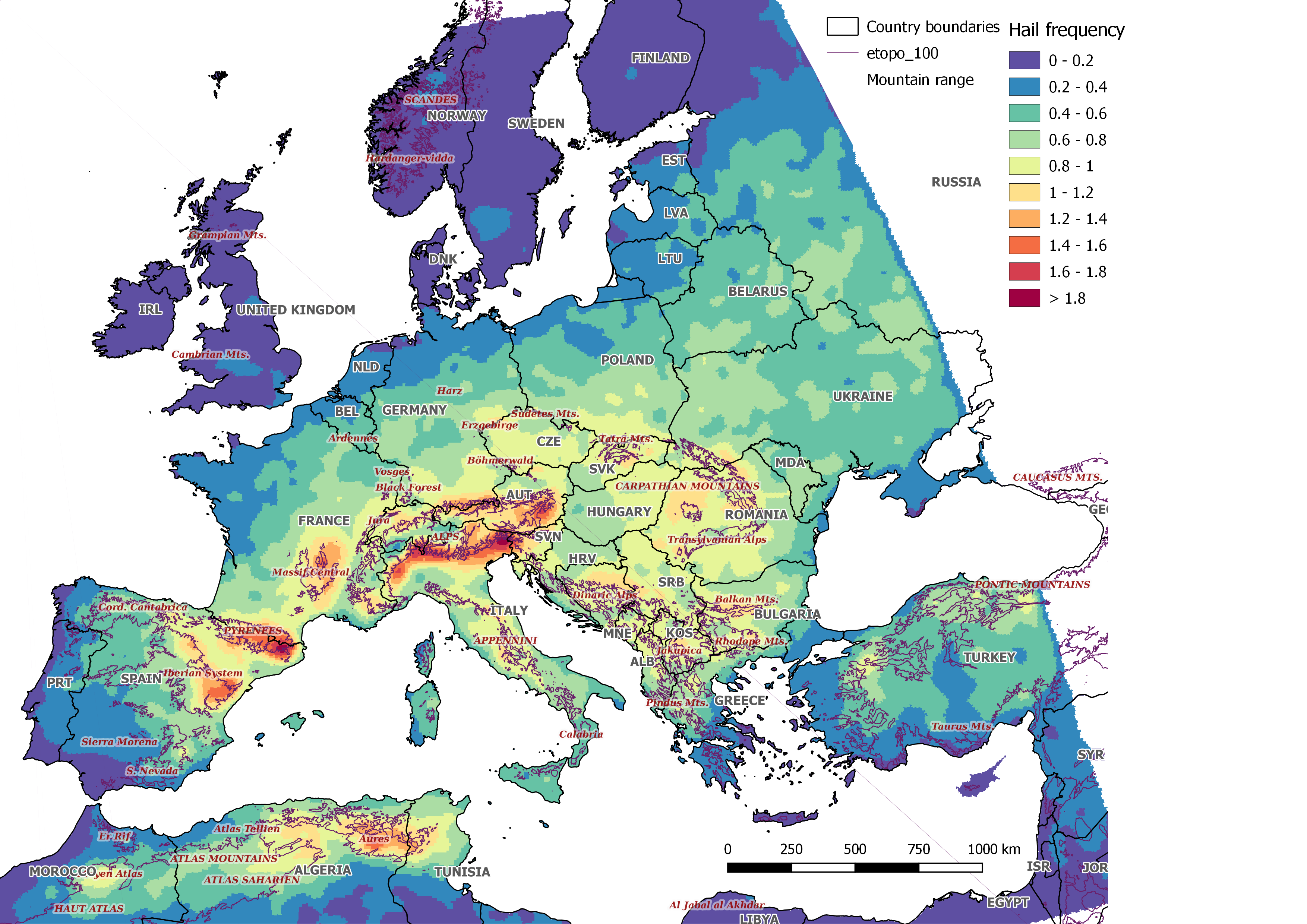 Bildunterschrift: Häufigkeit von Tagen mit Hagel in Europa: In Deutschland ist vor allem der Südwesten betroffen – insbesondere die windabgewandten Seiten von Höhenzügen wie dem Schwarzwald. (Karte: Heinz Jürgen Punge, IMK-TRO/KIT)