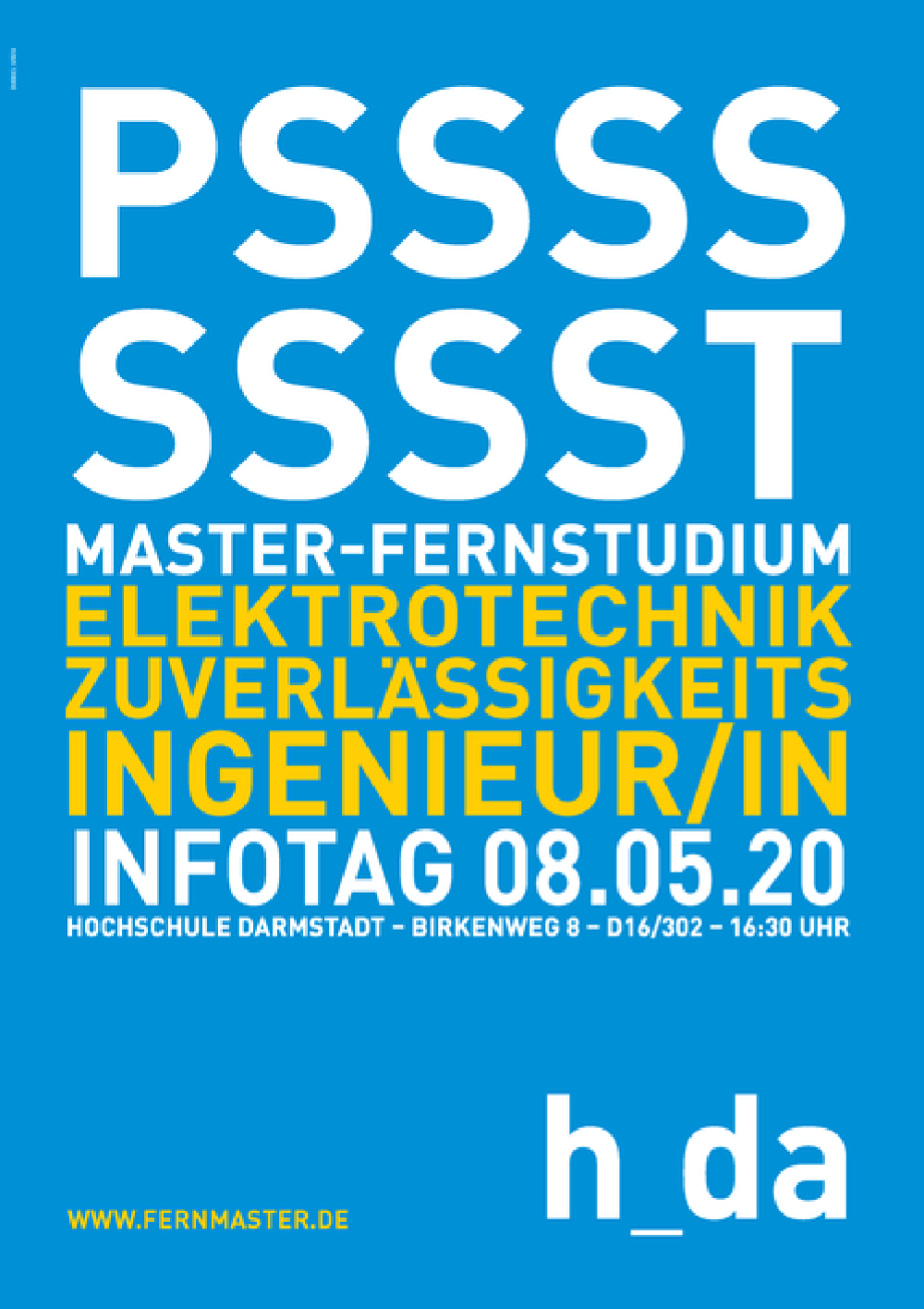 Darmstadt/Koblenz – Am Freitag, den 8. Mai 2020 lädt die Hochschule Darmstadt zu einer Informationsveranstaltung zu den beiden elektrotechnischen Fernstudiengängen Elektrotechnik (M.Sc.) und Zuverlässigkeitsingenieurwesen (M.Eng.) ein. Die Besucher erfahren alles über die Studieninhalte, den Ablauf und die Organisation des Fernstudiums und können individuelle Fragen stellen. Derzeitige Fernstudierende und Absolventen sind ebenfalls vor Ort und geben Informationen aus erster Hand weiter. Ein kleiner Imbiss bietet Gelegenheit zum persönlichen Austausch und zu Einzelgesprächen. Alle Interessierten sind um 16:30 Uhr an der Hochschule Darmstadt, Birkweg 8-10, Geb. D 16, Raum 302 in 64295 Darmstadt herzlich willkommen. Wer kommen möchte, wird gebeten sich telefonisch (06151) 16-30128 oder per Mail an fernmaster.fbeit@h-da.de anzumelden.