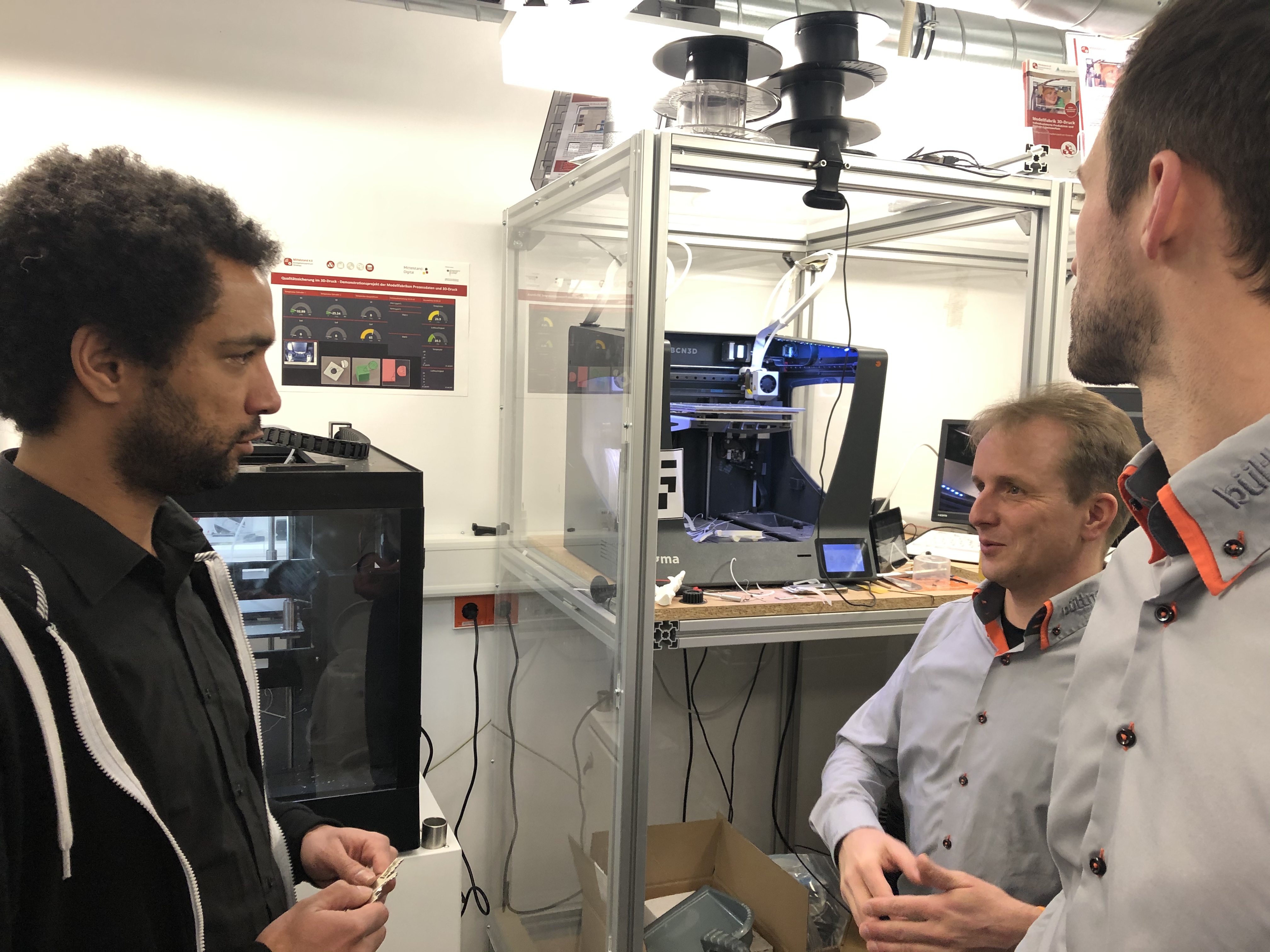 Neben Vorführungen zum wertschöpfenden Einsatz von Augmented Reality und Virtual Reality in der Industrie wurden die umfangreichen Angebote der Modellfabrik 3D-Druck („Individualisierte Produktion“ und „Digitale Arbeitswelten“ des Mittelstand 4.0-Kompetenzzentrums Ilmenau) durch die Hochschulkollegen Stefan Meier und Patrick Ongom-Along vorgestellt.