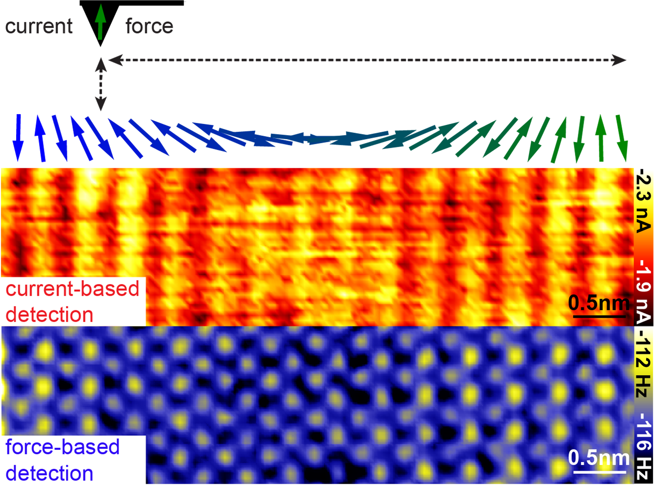 Bildunterschrift: Skizze des Messprinzips (oberes Bild): eine atomar scharfe, magnetische Spitze (Dreieck mit grünem Pfeil) wird über eine magnetische Spiralstruktur (grüne und blaue Pfeile zeigen die Ausrichtung der atomaren Stabmagnete) einer Metalloberfläche gerastert (horizontaler gestrichelter Pfeil). Gemessenes Strombild (unteres Bild) (gelb-roter Farbverlauf, „current-based detection“) und Kraftbild (gelb-blauer Farbverlauf, „force-based detection“). Im Kraftbild sieht man die einzelnen Atome der Oberfläche, die aufgrund der magnetischen Struktur unterschiedlich erscheinen. Der Balken unten rechts gibt die Skala an (0,5 nm=0,5 Nanometer).