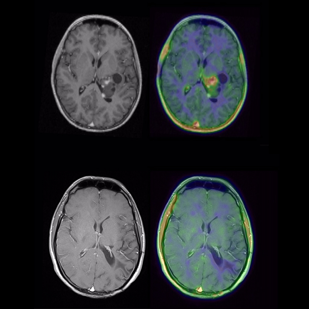 MRT eines Patienten mit Glioblastom vor (oben) und nach (unten) molekularer neuropathologischer Diagnostik und zielgerichteter Therapie. Die Wilhelm Sander-Therapieeinheit NeuroOnkologie ermöglicht neben einer gezielten Diagnostik auch die personalisierte Behandlung von Patienten mit Hirntumoren.