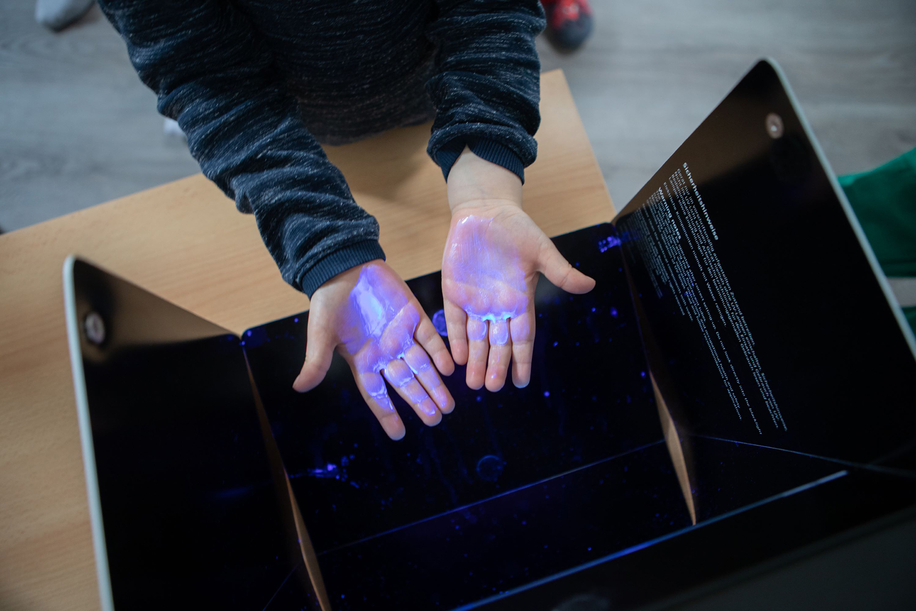Händewaschen ist außerdem nicht gleich Händewaschen. Nur durch langes und gründliches Einseifen der kompletten Hand, der Fingerzwischenräume und der Fingerspitzen kann man den Bakterien und Viren an seinen Händen den Kampf ansagen. So können die Kinder eine Ansteckungsgefahr verringern und sich und ihre Familien vor Krankheitserregern schützen. „Das Händewaschen sollte übrigens mindestens eine halbe Minute dauern. Das ist für Kinder natürlich eine lange Zeit. Zur Überbrückung kann daher ein Händewaschlied dienen“, rät Dr. Caplunik-Pratsch. Die Ärztin erklärte den Kindern außerdem, wann man sich die Hände waschen sollte: unter anderem nach dem Toilettengang, dem Spielen im Garten und dem Streicheln von Tieren sowie vor dem Essen. Unter UV-Licht konnten die Kinder testen, ob ihre Hände beim Waschen tatsächlich sauber geworden sind. Vor dem Händewaschen wurden außerdem Proben von den Bakterien an den Kinderhänden genommen. Die Kinder warteten gespannt, welche Keime auf den Abklatschpatten zum Vorschein kamen.