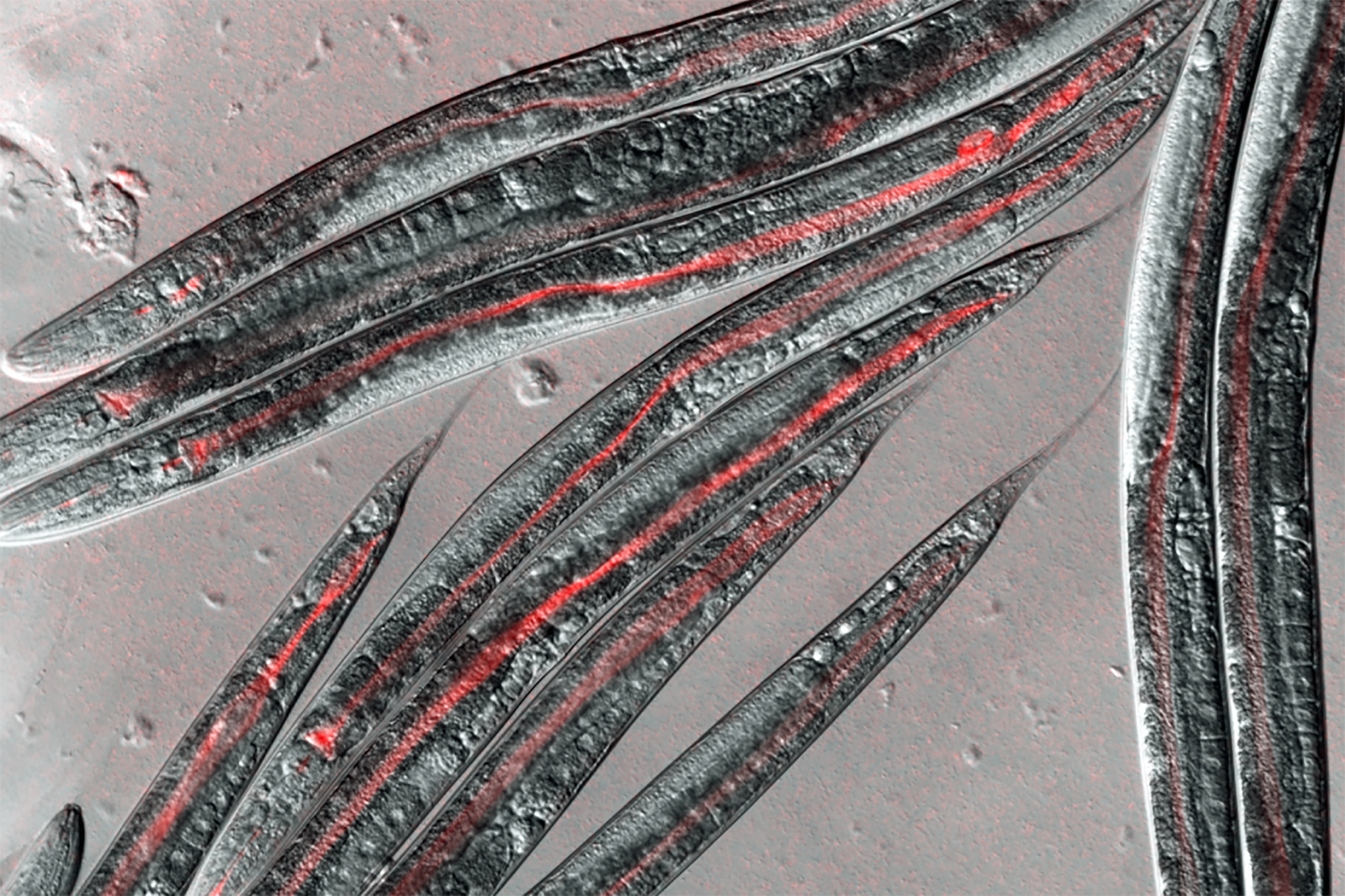 Caption: The worm’s microbiome (bacteria highlighted in red) is strongly influenced by the environment and also differs considerably between individual animals.