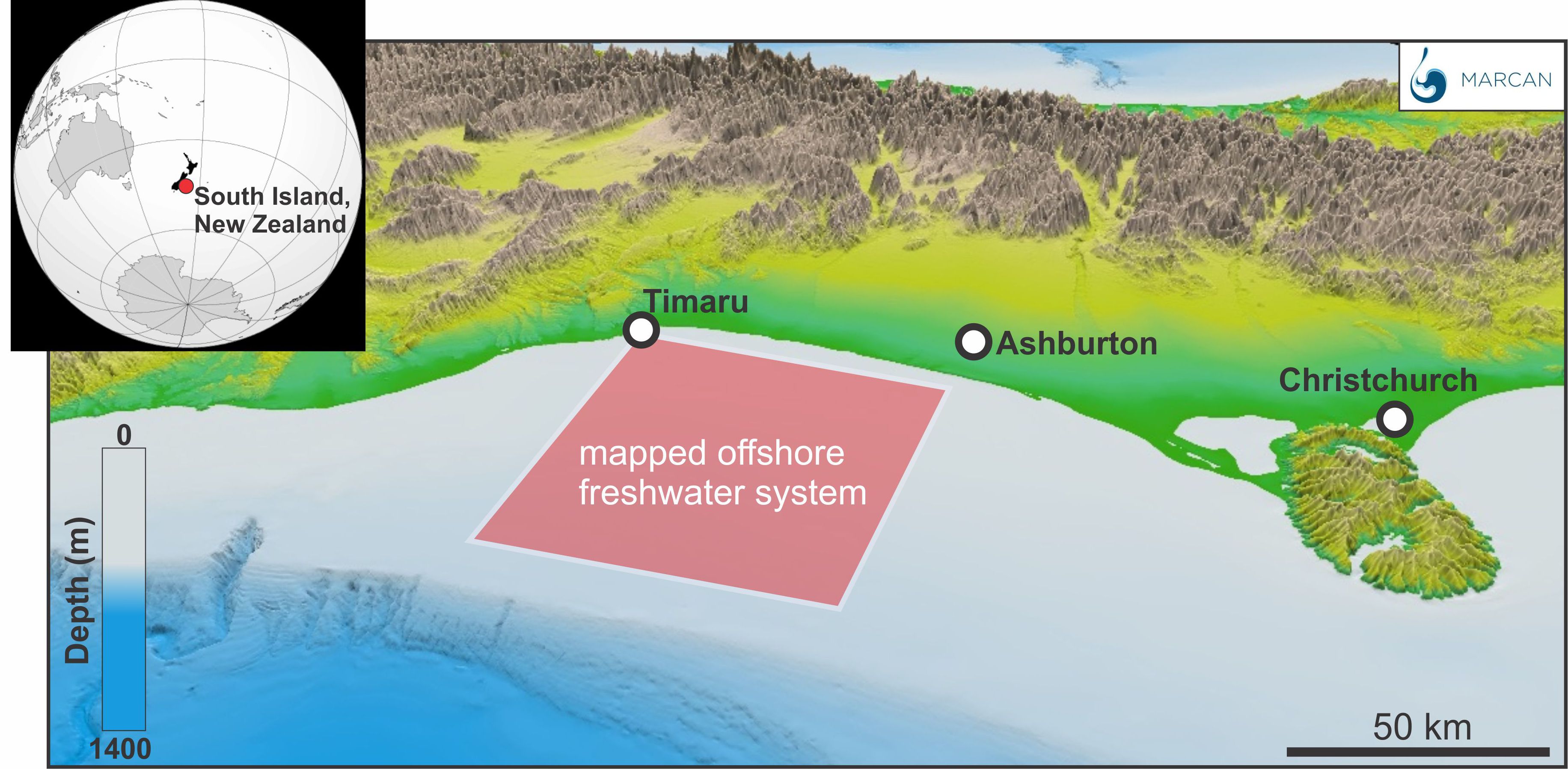 Trinkwasser ist in vielen Regionen der Erde, wie z.B. im Mittelmeerraum oder im Nahen Osten ein sehr kostbares Gut. Deshalb werden schon seit geraumer Zeit neue Süßwasserreservoire gesucht. Seit einigen Jahren weiss man, dass es in Küstennähe auch unterhalb des Meeresbodens Süßwasserspeicher gibt, die zum Teil aus terrestrischen Quellen gespeist werden. Im Rahmen des MARCAN Projektes, das vom Europäischen Forschungsrat, dem neuseeländischen Ministerium für Innovation und Arbeit, der US-amerikanischen National Science Foundation und der Deutschen Forschungsgemeinschaft gefördert wurde, hat ein internationales Team neue Methoden entwickelt und integriert, um Süßwasser unterhalb des Meeresbodens zu finden und zu kartieren. Dabei sind die Forschenden auf ein ausgedehntes Wasserreservoir vor der Südinsel Neuseelands gestoßen.