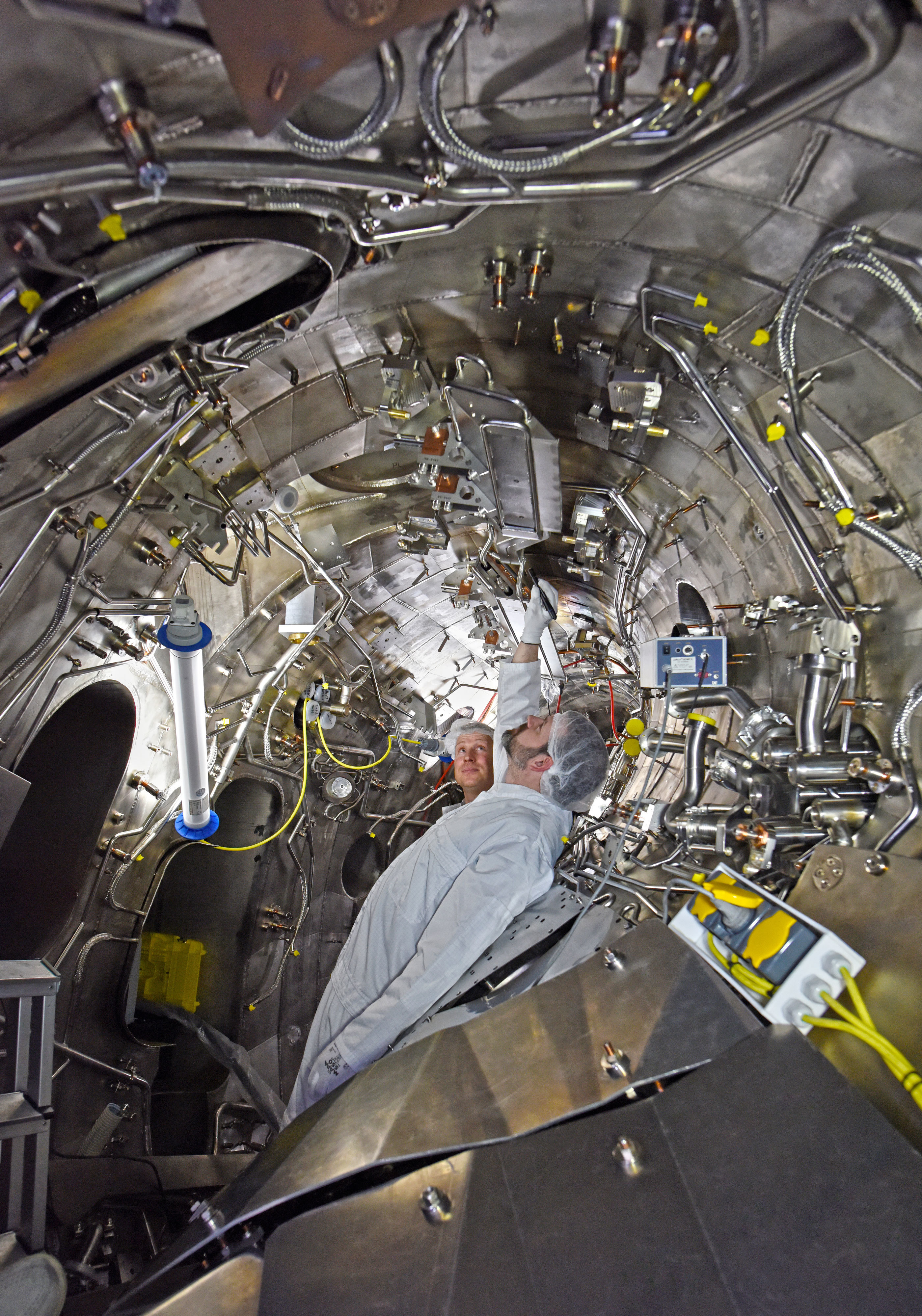 At Greifswald, everything is prepared for installation of the high-performance components: In particular, the water pipes are installed in the plasma vessel, a total of 4.5 kilometres. "In the meantime, we have started laying the complex water pipes that bridge the last 40 centimetres between the vessel wall and the divertor plates," explains assembly head Dr. Lutz Wegener. Later on, the plates must fit exactly to these connections. Although the extremely tricky work had previously been practised in a one-to-one model – "virtually a double assembly," says Dr. Wegener – there are surprises when installing the 240 fitting pipes. The great tightness between the components makes welding a challenge, for which a special precision technique is used anyway. Often new designs and new manufacturing are necessary. In the narrow space also many screws are difficult to access for tools and a solution has to be found on a case-by-case basis: "Welded or screwed – the connections should remain tight for the next twenty years".