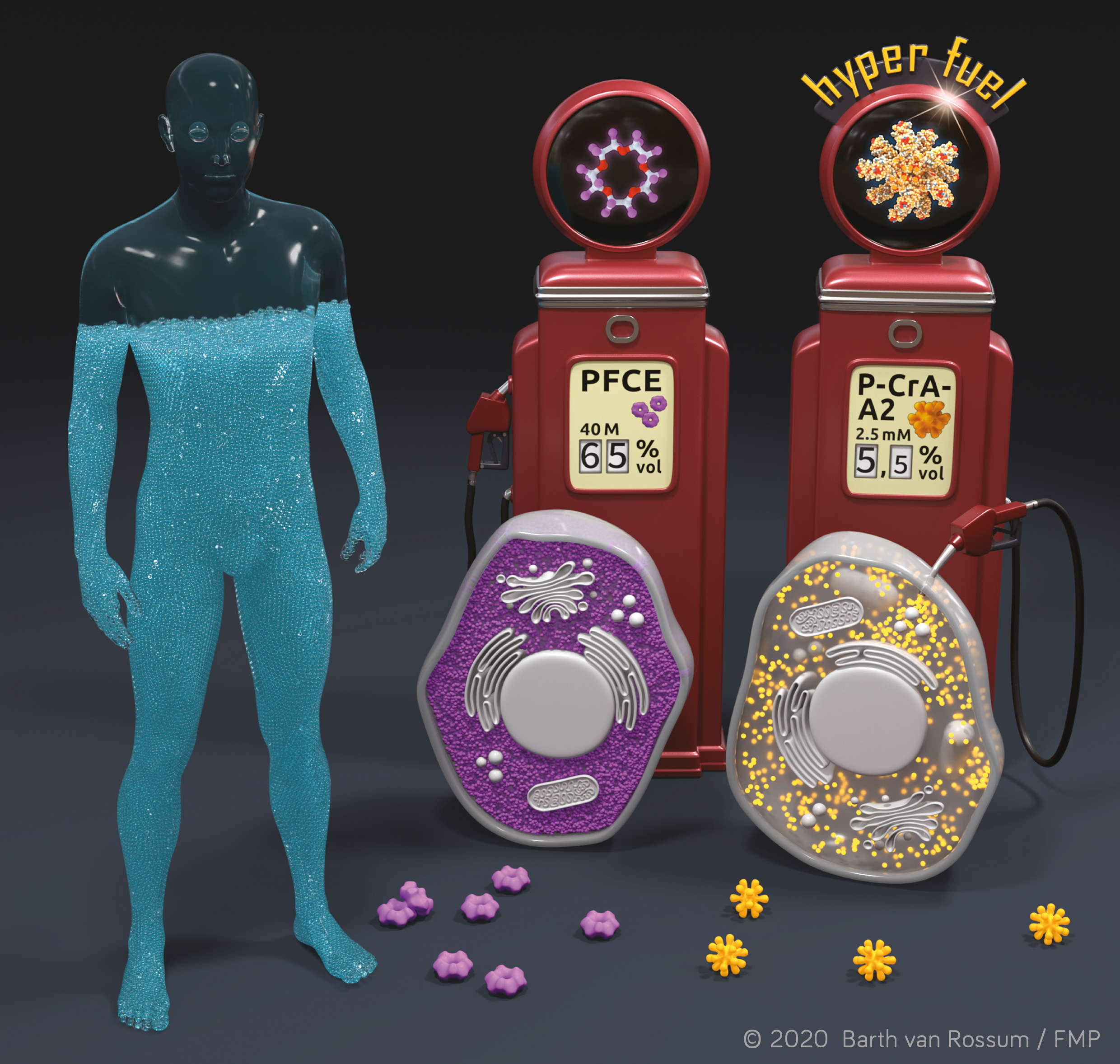 Um die Mizellen für den diagnostischen Einsatz nutzbar zu machen, ließen Schröder und sein Team sie umbauen: „Wir haben molekulare Käfige – synthetische Moleküle in Form eines hohlen Fußballs – eingefügt, in denen wir das Xenon kurzzeitig einschließen können. Pro Mizelle konnten wir also 19 Xenon-Beladungen für den Bildkontrast „anschalten“ und damit diese Art der sich im Tumor bildenden Zellen direkt visualisieren“, berichtet Leif Schröder.