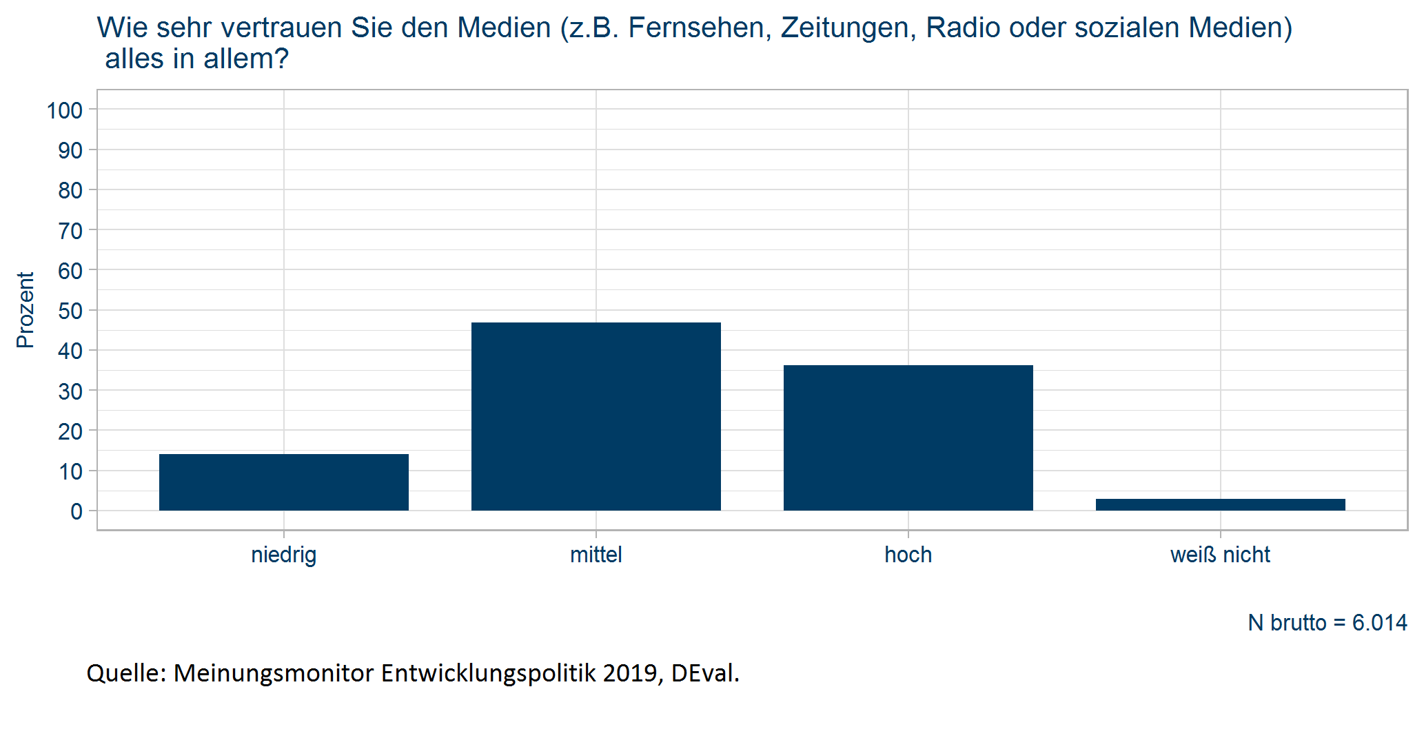 Trotz der teilweise als verzerrt empfundenen Berichterstattung vertraut die Bevölkerung den Medien in großen Teilen: 36 % bringen ihnen ein hohes, 47 % ein mittleres Vertrauen entgegen. Nur knapp über 10 % der Bevölkerung geben an, ein niedriges Vertrauen in das mediale Gesamtangebot zu haben.