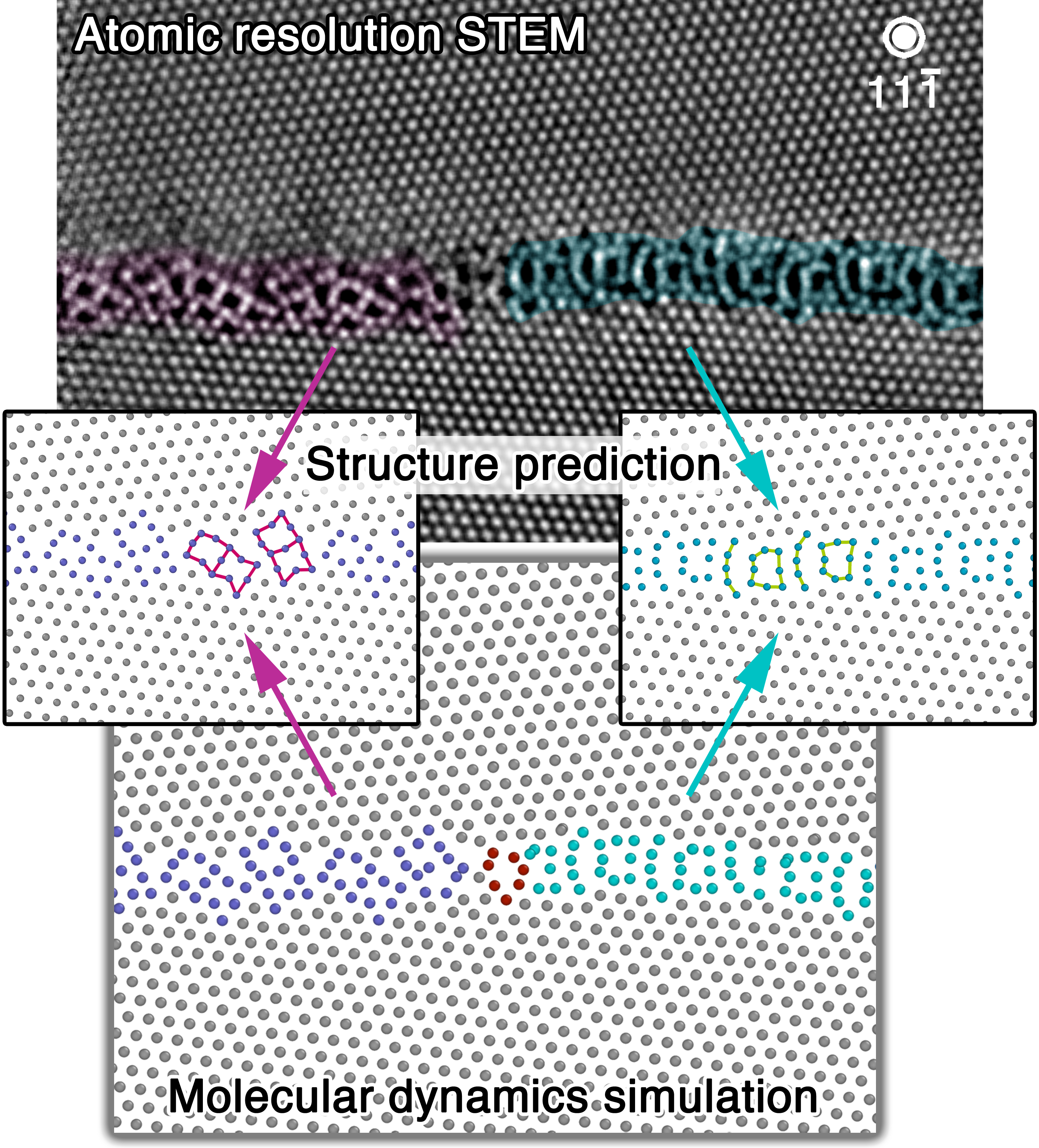 Their results are surprising: “The search for congruent transformations has all the aspects of a search for a needle in a 6+C dimensional haystack.” This quote by John W. Cahn, material scientist and expert for thermodynamics, describes the complexity of experimentally proofing their existence and the team of MPIE and LLNL even found two of these “needles”. The key was to utilize the atomic resolution microscopes at the MPIE to directly visualize the transforming interfaces. “We did not expect that we will see grain boundary phase transformations but our results clearly show that two grain boundary motifs coexist with different atomic arrangements. However, the grain boundary plane orientation, crystallite misorientation and chemical composition does not change. Through these observations we have to re-think how interfaces behave while exposing a material to temperature and/or stress”, explains Liebscher. He and his colleagues analysed thin films of pure copper particularly by atomic resolved transmission electron microscopy. This way, they unlocked the grain boundary phases and proofed their coexistence with atomic precision. The phases can be atomistically described as motifs with pearl and domino-shaped structure (see Fig. 1). Dr. Timofey Frolov and Dr. Robert Rudd, from the Lawrence Livermore National Laboratory, modelled the grain boundary phases. They used a novel grain boundary structure search algorithm, which is capable of finding the experimentally observed structures. Moreover, their finite-temperature molecular dynamics simulations explore the transformation kinetics. The predicted structures not only perfectly resemble the experimental observations, but demonstrate that the grain boundary phases can transform into each other by changing temperature or stress. Additionally, the simulations indicate that the grain boundary phase junction, a novel line defect which has not been considered previously, is rate controlling. “We discovered by modelling that the speed of the transformation largely depends on the migration of the phase junction. It takes only a few tens of nanoseconds in case of a short defect to complete the transformation from the domino to the pearl structure. Whereas no transformation is observed when the defect length exceeds a few nanometres and takes place below 500 K.”, explains Dr. Thorsten Meiners, first author of the publication and former doctoral researcher at the MPIE. Furthermore, the grain boundary phases are characterized by different properties, which determine how the interface phases move, how they take up impurity elements or how they mechanically deform.
