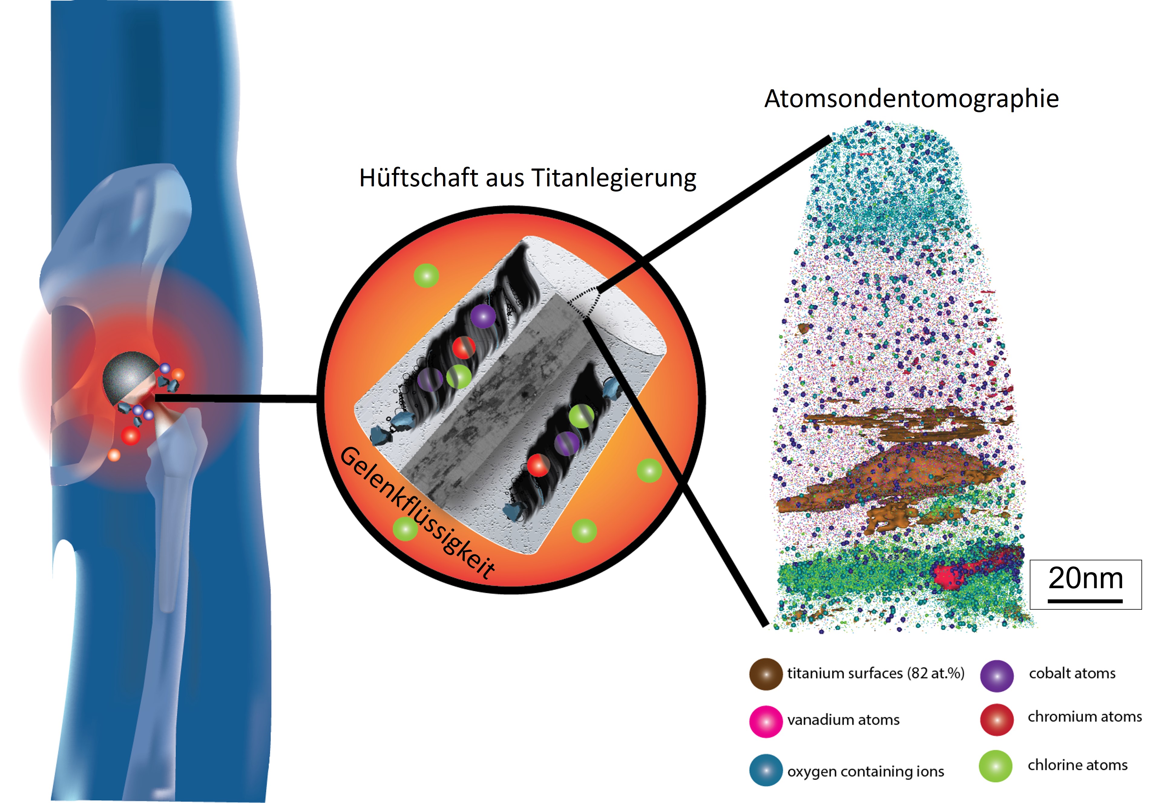 2015 wurden in den Industrieländern 1,8 Millionen Hüftoperationen durchgeführt. Aufgrund der höheren Lebenserwartung wird die Zahl der Hüftendoprothesen schätzungsweise auf 2,8 Millionen bis 2050 ansteigen. Am Ende des letzten Jahrtausends hielten künstliche Hüftprothesen nur etwa 10 Jahre. Seitdem haben sich Ärzte verstärkt mit Materialwissenschaftlerinnen und -wissenschaftlern zusammengetan, um länger haltbare Implantate zu bauen, mit dem Ziel, Revisionsoperationen nach der Implantation zu vermeiden. Die Forscher befassen sich unter anderem mit der Freisetzung von winzig kleinen Metallpartikeln und Ionen aus dem Implantat in das umgebende Gewebe, ein Prozess, der durch kombinierte Mikrobewegungen und Korrosion zwischen den modularen Teilen der künstlichen Hüfte beschleunigt wird. Um die zugrundeliegenden Mechanismen auf atomarer Ebene zu identifizieren, analysierten Dr. Michael Herbig, Leiter der Gruppe "Materialwissenschaft der mechanischen Kontakte" am Max-Planck-Institut für Eisenforschung (MPIE), und sein Team, Kobalt- und Titanlegierungen, die in Hüftimplantaten verwendet werden. In Zusammenarbeit mit Prof. Alfons Fischer und Prof. Markus Wimmer vom Rush University Medical Center in Chicago, USA, modellierten die Wissenschaftler die Belastungen und die Umgebung des Hüftgelenks experimentell im Labor. Die Ergebnisse wurden kürzlich in der Fachzeitschrift Advanced Science veröffentlicht.
