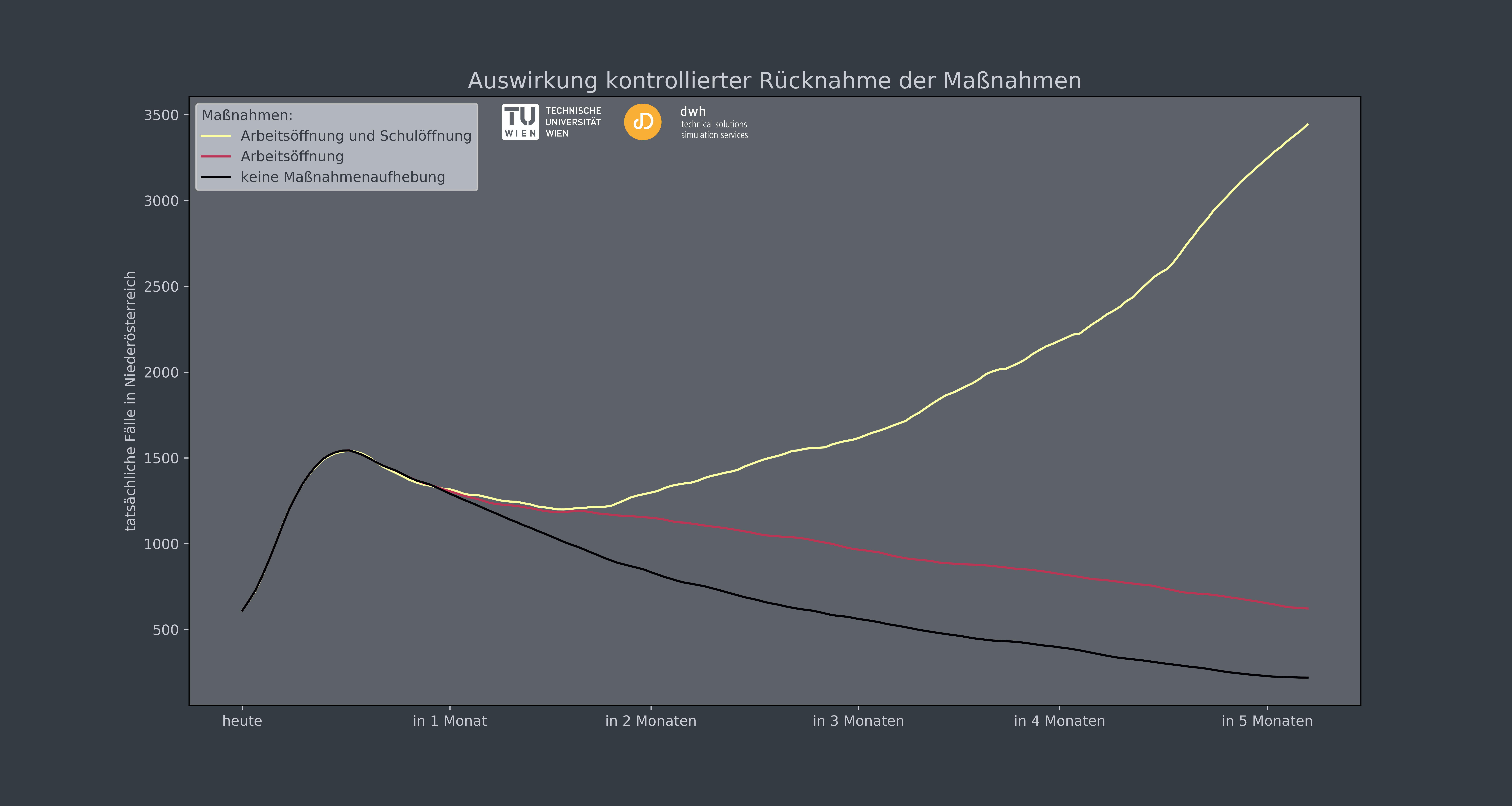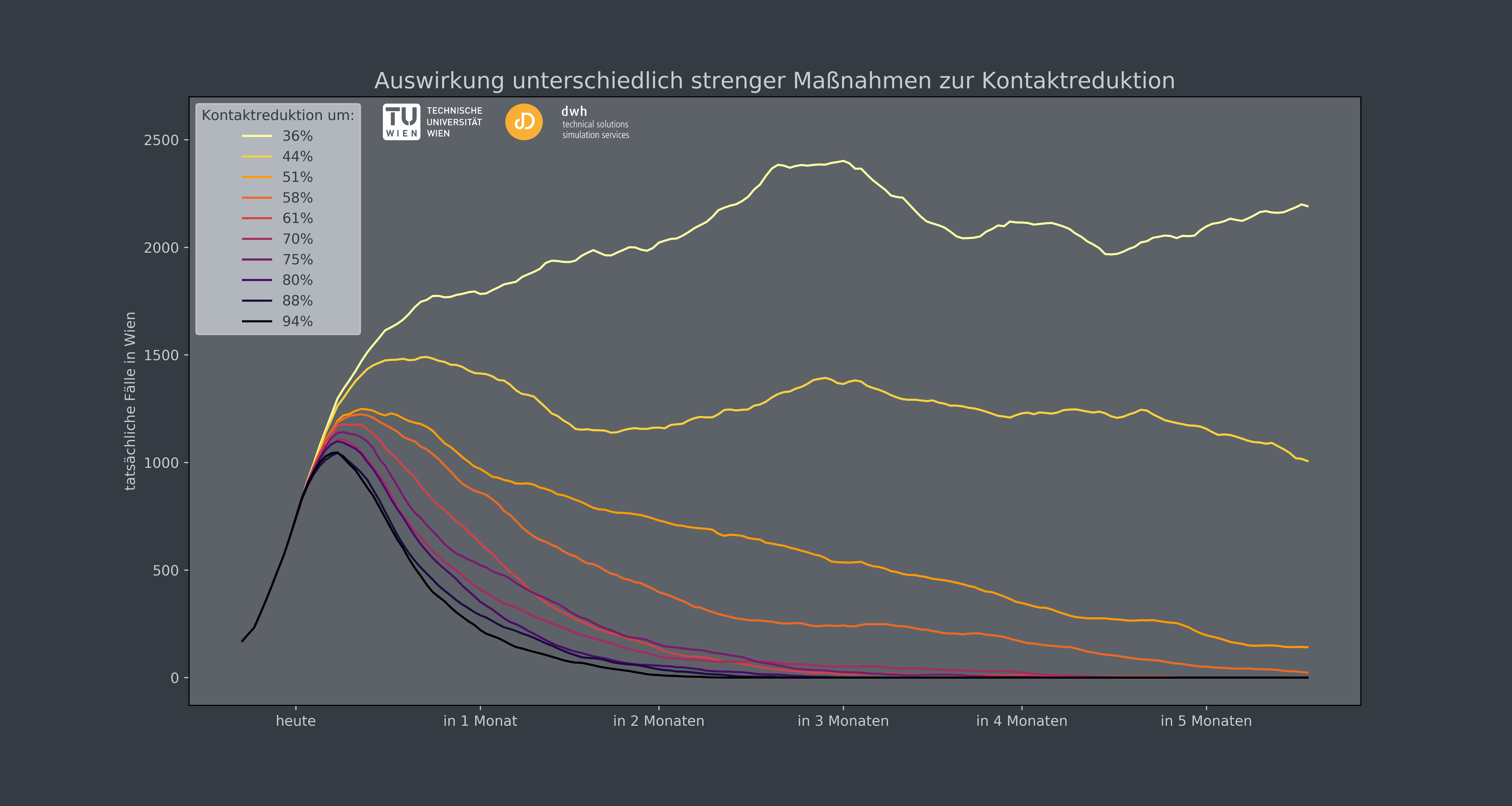 Simulationsrechnungen der TU Wien und des TU-Spin-Offs dwh zeigen: Eine noch drastischere Einschränkung der Kontakte hätte kaum zusätzlichen Nutzen. Falsch wäre es allerdings, zu rasch wieder zum normalen Alltagsleben zurückzukehren. Dann würde sich die Epidemie nämlich sofort wieder sehr rasch ausbreiten und die Vorsichtsmaßnahmen der letzten zwei Wochen wären umsonst gewesen. Empfohlen wird, in den nächsten Wochen und Monaten die Maßnahmen schrittweise zurückzunehmen.