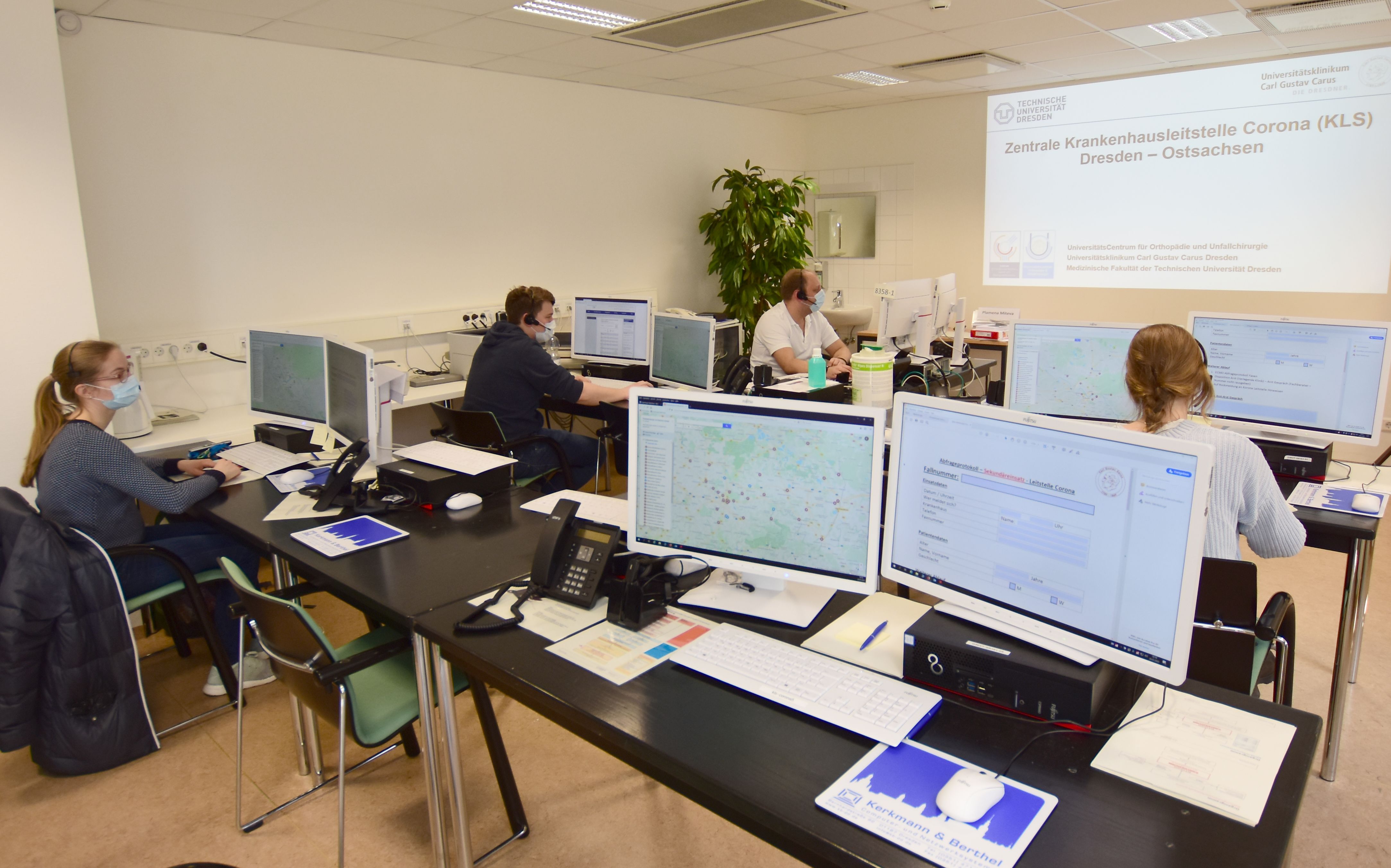 Nach der am Freitagnachmittag (20. März) in der Staatskanzlei gefallenen Entscheidung, die Vergabe der Krankenhausbetten für Patienten mit bestätigter COVID-19-Infektion oder deutlichen Anzeichen dafür in den drei Regionen Nordsachsen (Leipzig), Westsachsen (Chemnitz) sowie dem Großraum Dresden mit Ostsachsen zu zentralisieren, ist es den Teams des Dresdner Uniklinikums gelungen, in knapp vier Tagen die „Zentrale Krankenhausleitstelle Corona Dresden / Ostsachsen“ zu etablieren und den Betrieb aufzunehmen. Dafür wurden sieben Arbeitsplätze in einem Konferenzraum eingerichtet, die jeweils mit Computern und Telefonen ausgestattet sind. In derselben Zeit entwickelte das Team ein System, das die in den Kliniken verfügbaren Betten ebenso registriert wie die durch die Rettungsteams gemeldeten Patienten. Derzeit sind es maximal sechs Disponenten und ein Lagedienstführer, die aufgrund dieser Basis im direkten Austausch mit den Notfallteams vor Ort ein geeignetes Krankenhaus für die Patienten auswählen. Die in diesem Rahmen getroffenen Entscheidungen orientieren sich an den von der Weltgesundheitsorganisation (WHO) und medizinischen Fachgesellschaften herausgegebenen Empfehlungen und berücksichtigen die bereits getroffenen Vereinbarungen zu den lokalen Gegebenheiten.
