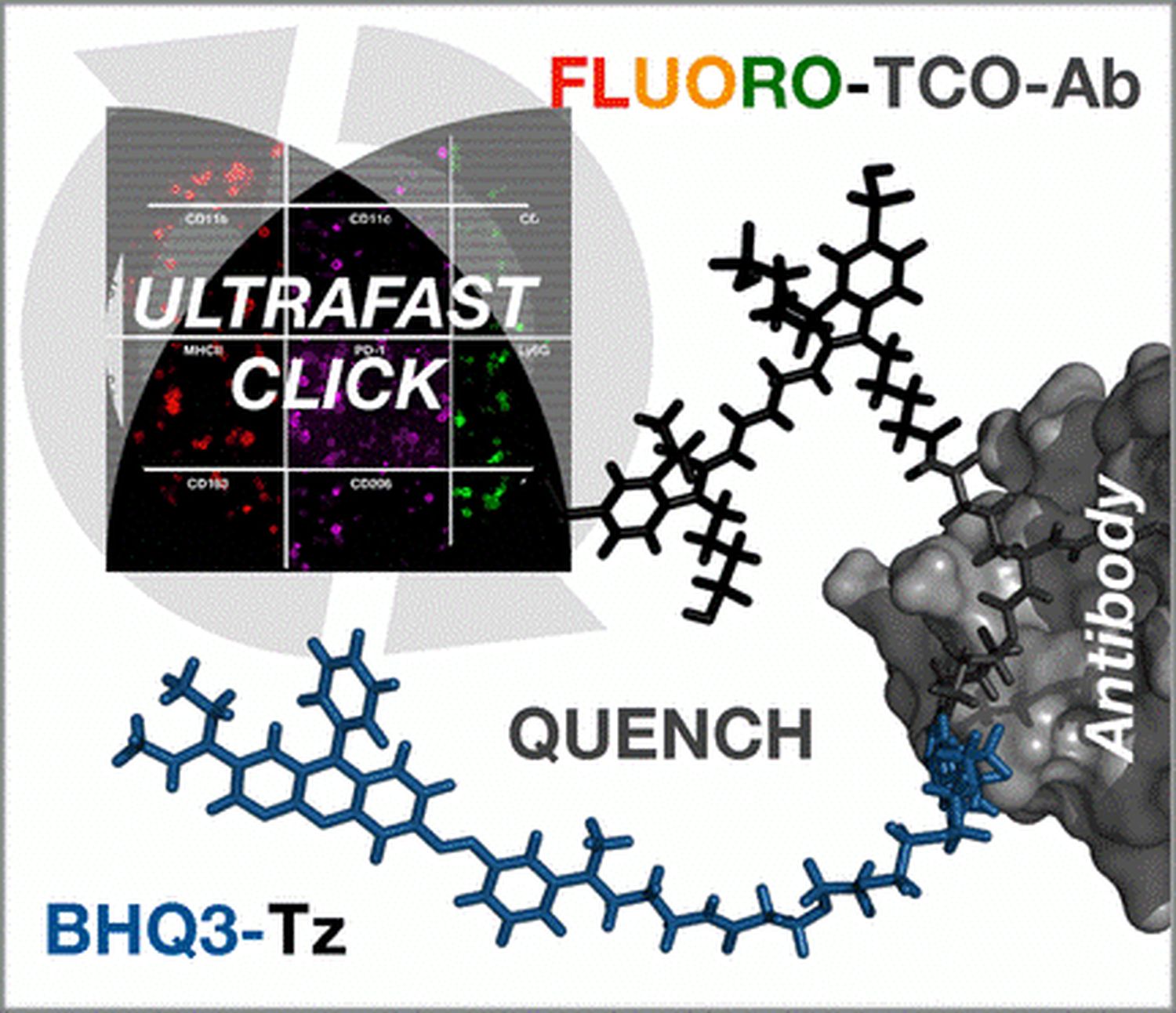 Das Team um Jonathan Carlson und Ralph Weissleder vom Massachusetts General Hospital Research Institute sowie der Harvard Medical School (Boston, MA, USA) hat jetzt eine ultraschnelle, hocheffiziente und dabei sanfte zyklische Methode für ein Multiplex-Protein-Profiling einzelner Zellen entwickelt, mit der eine Vielzahl verschiedener Färbungen gelingt. Statt den Farbstoff abzuspalten oder zu bleichen, wird die Fluoreszenz des Farbstoffs einfach mit einem sogenannten Black Hole Quencher „ausgeknipst“. Black Hole Quencher absorbieren die Energie eines Fluoreszenzfarbstoffs über das komplette sichtbare Spektrum und wandeln sie in Wärme um, sobald sie nah genug herankommen, und löschen so das Leuchten des Farbstoffs aus.
