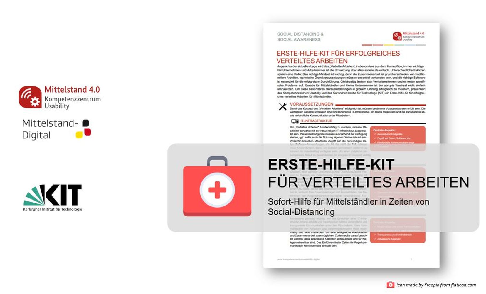 Das am IISM von Ivo Benke, Nevena Nikolajevic und Alexander Mädche entwickelte Erste-Hilfe-Kit ist Teil des am Kompetenzzentrum Usability betriebenen Projekts „Social Distancing und Social Awareness“. Das KU ist eine Einrichtung der „Mittelstand-Digital“-Initiative des Bundesministeriums für Wirtschaft und Energie (BMWi). Es unterstützt kleine und mittlere Unternehmen dabei, digitale Technologien so zu gestalten, dass sie einfach genutzt und positiv erlebt werden können.