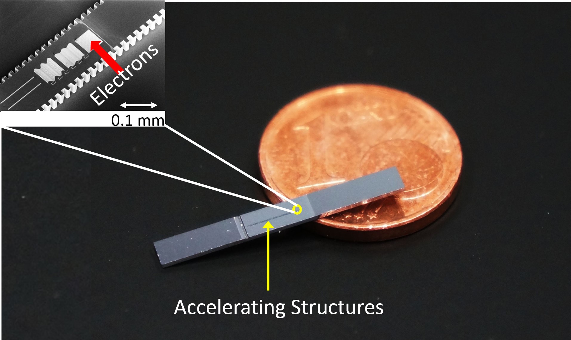 Doch Peter Hommelhoff und sein Team wollen noch weiter gehen. Der von ihnen geplante Elektronen-Teilchenbeschleuniger soll lediglich so groß wie ein Mikrochip sein. „Wir streben eine Verringerung der Größe gängiger Teilchenbeschleuniger um den Faktor 100 auf an – klinische Beschleuniger könnten so etwa einen Zentimeter klein werden“, erklärt Prof. Hommelhoff. Der photonische Beschleuniger selbst besteht aus einem Elektronen-Kanal, der in eine Glasplatine eingeätzt ist. Die Wände des winzigen Kanals sind mit einer Riffelung versehen. Wird hier Licht hineingeschossen, wird dieses durch die komplexe Struktur so verändert, dass das Elektron auf den Lichtwellen wie ein Surfer reitet und so vorwärtsgetrieben wird. Dabei soll das Elektron am Ende der Beschleunigung genauso energiereich sein, wie in einem der heute handelsüblichen größeren Beschleuniger.