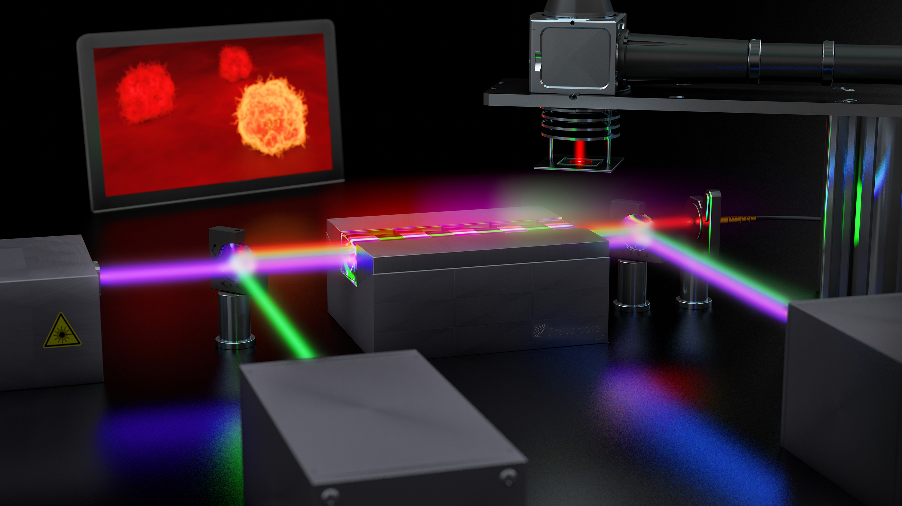 Optische Analyseverfahren wie Mikroskopie und Spektroskopie sind in sichtbaren Wellenlängenbereichen schon äußerst effizient. Doch im Infrarot- oder Terahertzbereich stoßen sie an ihre Grenzen. Dabei liegen gerade dort wertvolle Informationen verborgen. Zum Beispiel lassen sich Biosubstanzen wie Proteine, Lipide oder auch andere chemische Elemente anhand ihrer charakteristischen Molekülschwingungen unterscheiden. Diese Schwingungen werden mit Licht im mittleren Infrarot- bis Terahertz-Bereich angeregt und sind mit herkömmlichen Messmethoden nur schwer detektierbar. »Könnte man diese Bewegungen erfassen oder anregen, ließe sich bei Zellproben genau sehen, wie bestimmte Eiweiße, Fette oder andere Stoffe verteilt sind. Zum Beispiel weisen einige Krebsarten eine charakteristische Anreicherung bzw. Exprimierung bestimmter Proteine auf. So könnte die Krankheit effizienter erkannt und bekämpft werden. Auch in der Medikamentenforschung könnte ein genaueres Wissen über die Verteilung von Biosubstanzen große Fortschritte bringen«, ist Quantenforscher Dr. Markus Gräfe vom Fraunhofer IOF überzeugt.