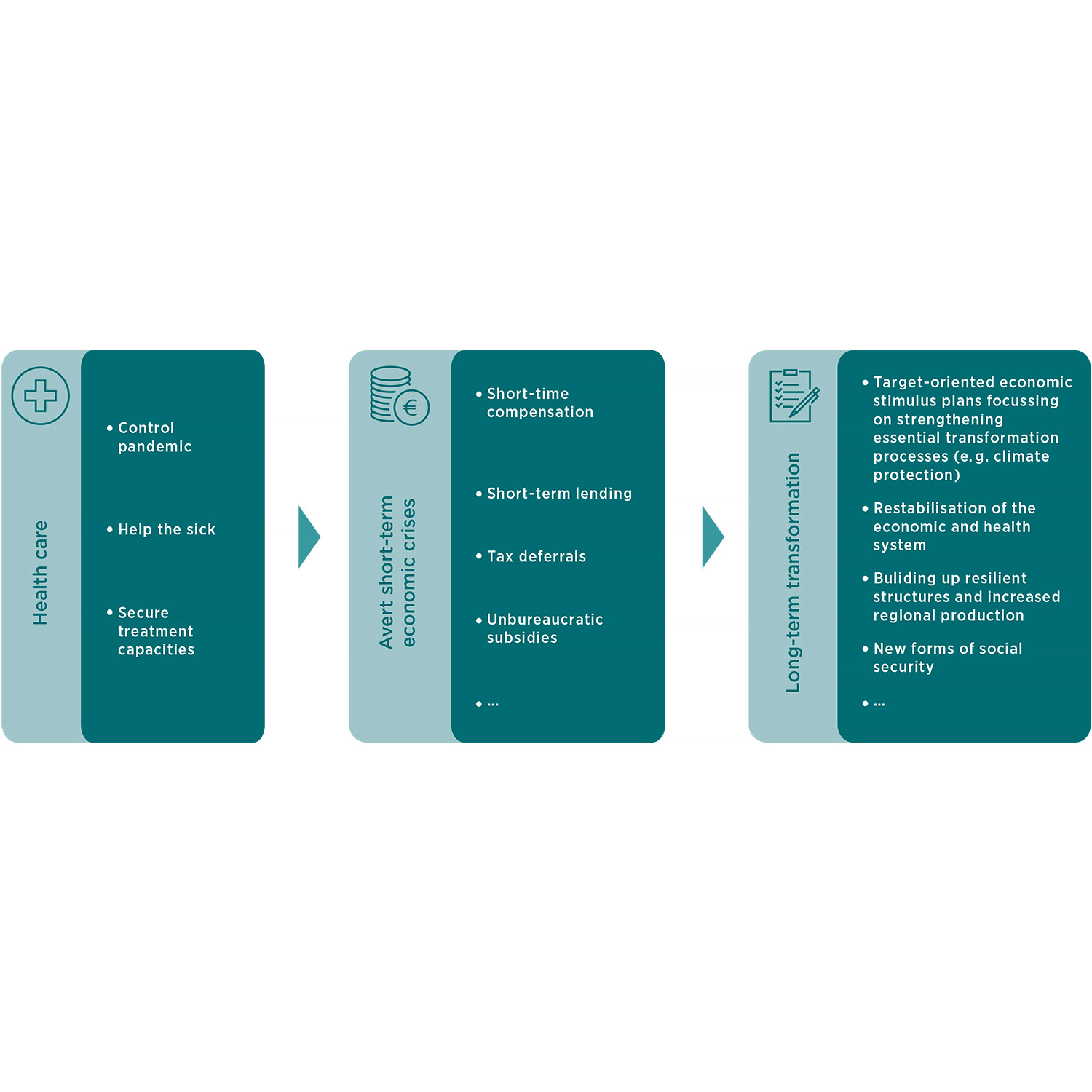 In the current discussion paper “The Corona Crisis and Climate Protection – Keeping Long-Term Goals in Mind”, the two Scientific Managing Directors of the Wuppertal Institute, Prof. Dr. Uwe Schneidewind and Prof. Dr. Manfred Fischedick, distinguish between health care (1), avert short-term economic crises (2) and long-term transformation (3).