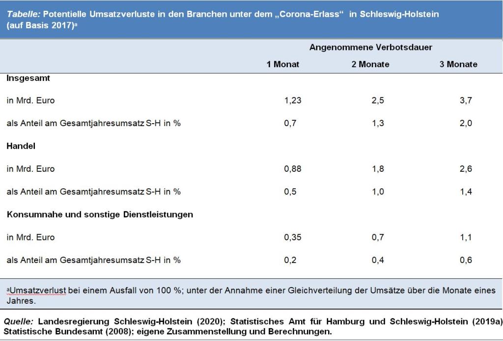 Dauern die vom Land verhängten Tätigkeitsverbote zwei Monate, was ungefähr dem von der Bundesregierung anvisierten Zeitraum bis nach Ostern entspricht, gehen den betroffenen Unternehmen in Schleswig-Holstein insgesamt etwa 2,5 Milliarden Euro an Umsätzen verloren, bei drei Monaten wären es 3,7 Milliarden Euro.