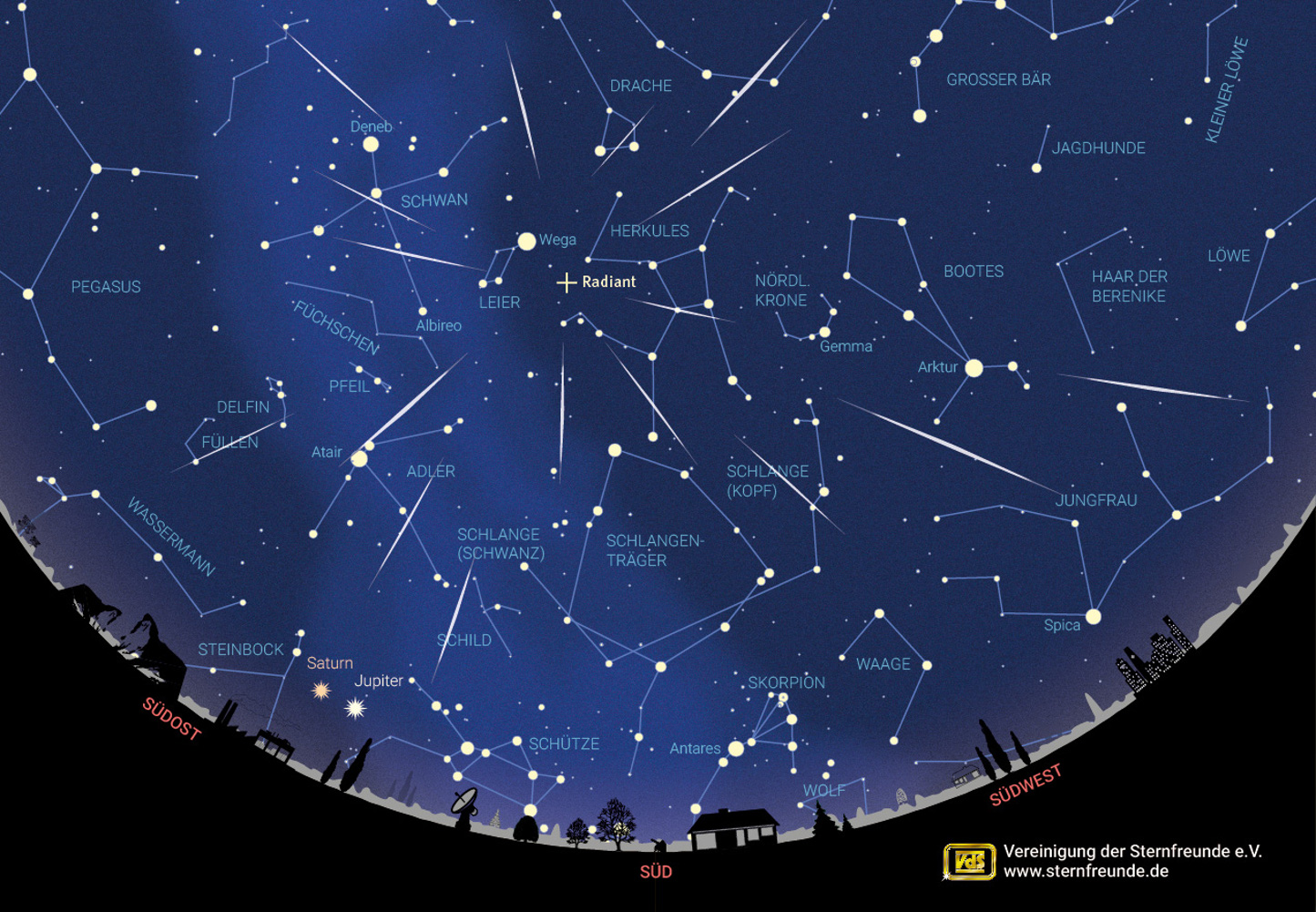 Wer lange wach bleibt oder früh aufsteht, kann in diesem Jahr zusätzlich noch die Planeten Jupiter und Saturn tief über dem südöstlichen Horizont sehen.