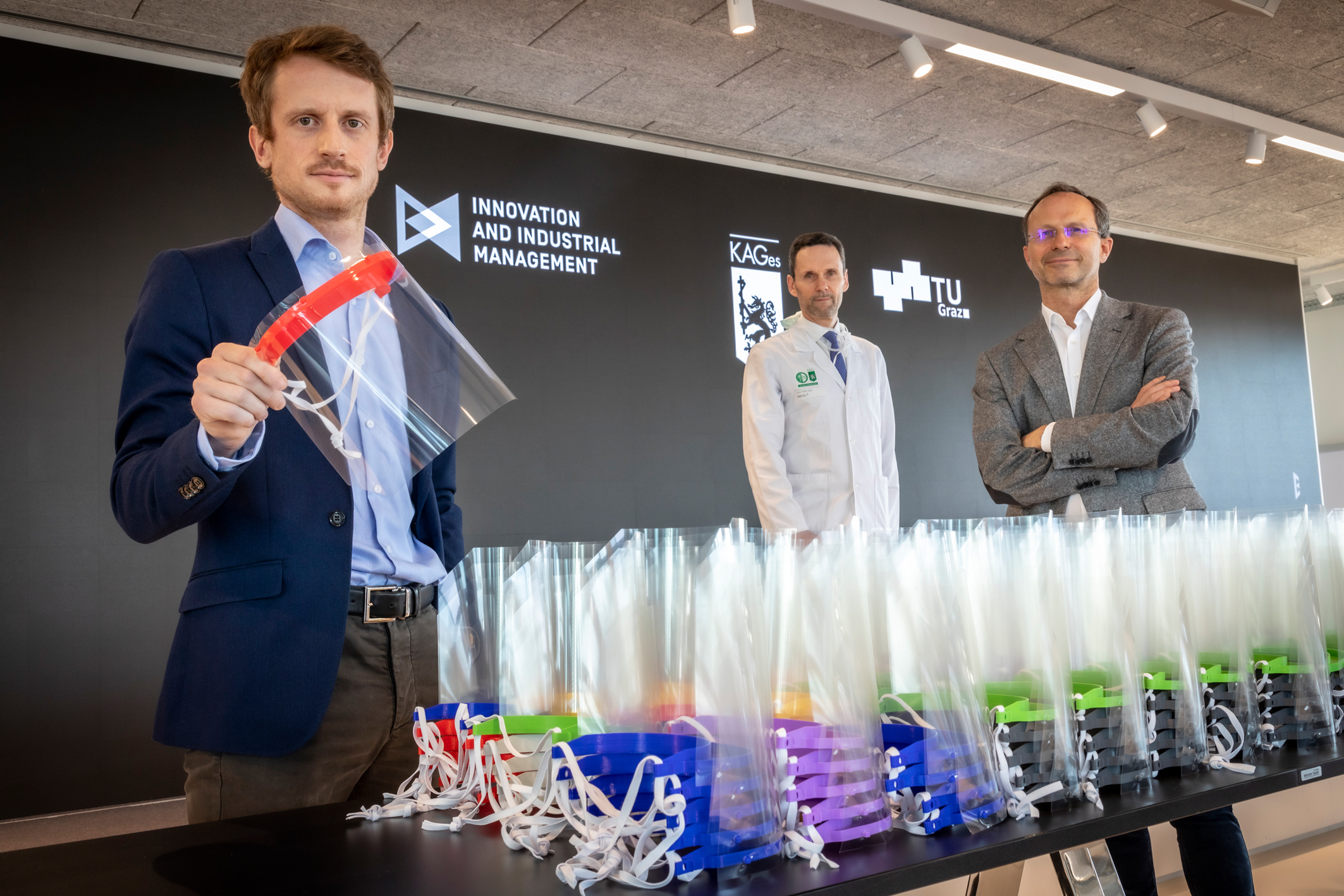 The protection of medical staff is a major priority in the current corona crisis. However, face masks and protective clothing are difficult to obtain in suitable quality on the world market these days. Thanks to an initiative of Christian Ramsauer, head of the Institute of Innovation and Industrial Management at Graz University of Technology and his deputy Hans Peter Schnöll together with Dr. Philipp Metnitz, head of the Clinical Department for General Anaesthesiology, Emergency and Intensive Care Medicine at Med Uni Graz, KAGes is now rapidly receiving a large quantity of urgently needed protective face shields.