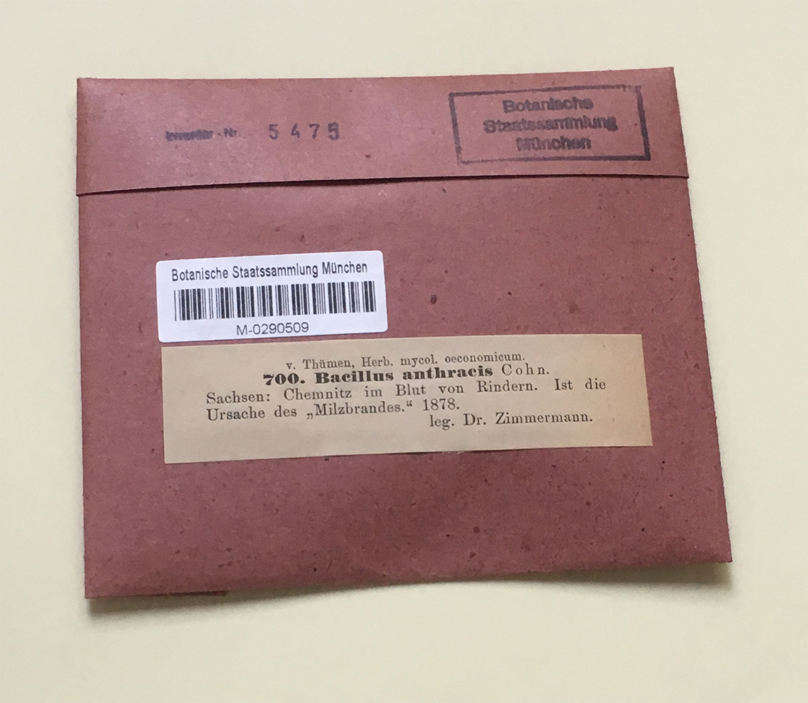 Über die historische genetische Entwicklung und geografische Verbreitung des Milzbrand-Erregers (auch als Anthrax-Erreger bekannt) ist bisher - anders als bei anderen Krankheitserregern wie Yersinia pestis (Pest) oder Mycobacterium tuberculosis (Tuberkulose) - nur wenig bekannt. Umso erstaunter war Dr. Dagmar Triebel, Kuratorin für Pilze und Algen an der Botanischen Staatssammlung München (SNSB-BSM), als sie bei einer Bestandsaufnahme in der Pilzsammlung auf einen Sammlungsumschlag mit der Beschriftung „Bacillus anthracis, Chemnitz, 1878“ stieß. Der Umschlag enthielt einen historischen Objektträger, auf dem mutmaßlich ein Tropfen Blut eines mit dem Milzbrand-Erreger infizierten sächsischen Rindes aufgebracht und eingetrocknet war. Die Blutprobe stammt damit annähernd aus dem gleichen Zeitraum, in dem es dem deutschen Arzt und Mikrobiologen Robert Koch in seinen bahnbrechenden Studien gelang, den Lebenszyklus des Bakteriums aufzudecken (1876).