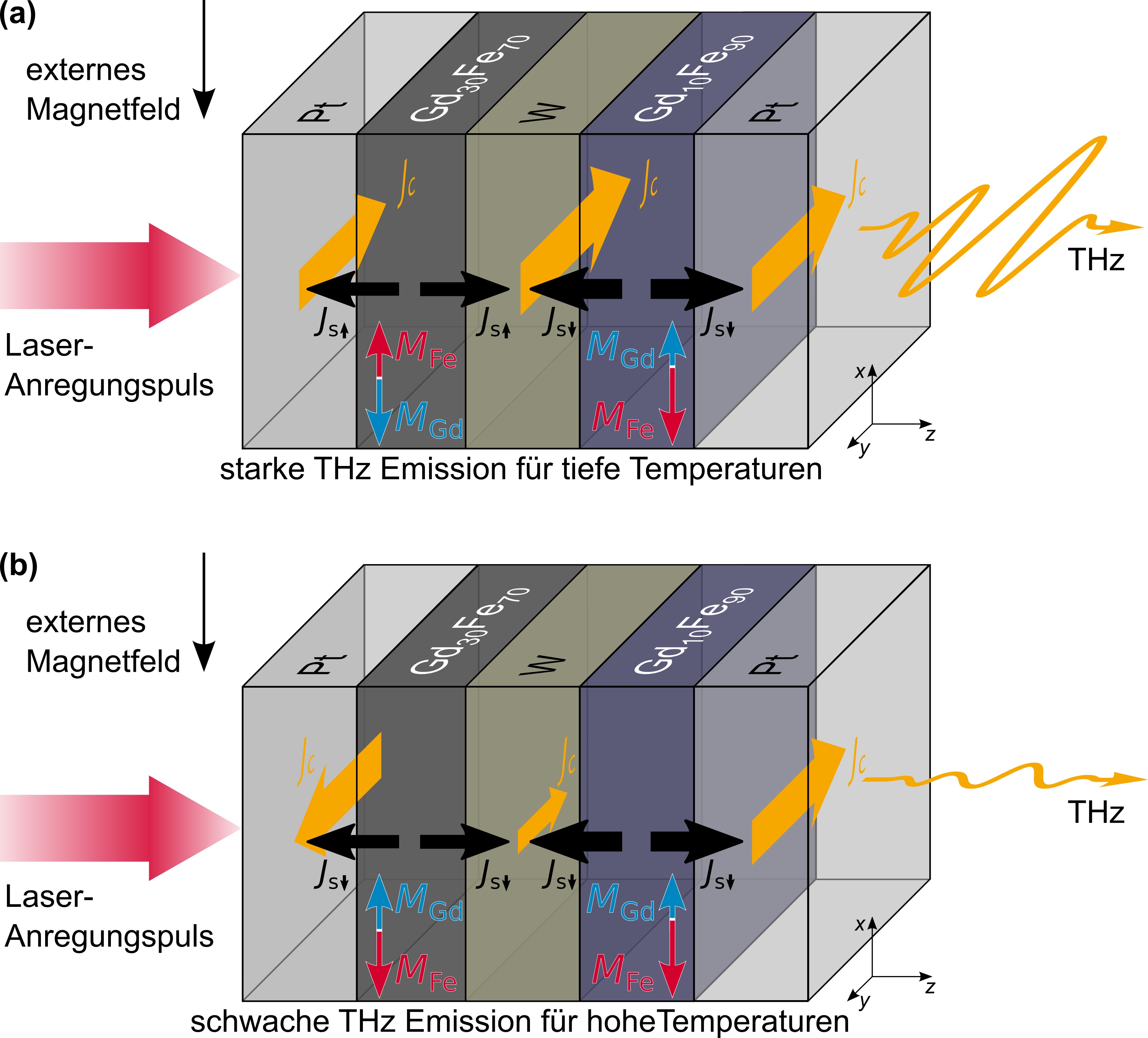 Schemazeichnung des neuartigen Emitters. Bei niedrigen Temperaturen (oben) haben die Elektronen des Eisens in den beiden Gadolinium-Eisen-Schichten einen entgegengesetzten Spin. Beim Übertritt in die äußeren Platin-Schichten werden die Elektronen der rechten Schicht daher nach links abgelenkt, die der linken Schicht dagegen nach rechts (in der mittleren Wolfram-Schicht ist die Ablenkungsrichtung genau umgekehrt). Die Strompulse, die dabei entstehen, sind gleichgerichtet; die Strahlung wird verstärkt. Bei hohen Temperaturen (unten) entstehen dagegen entgegengesetzte Strompulse, die sich in ihrer Wirkung nahezu aufheben.