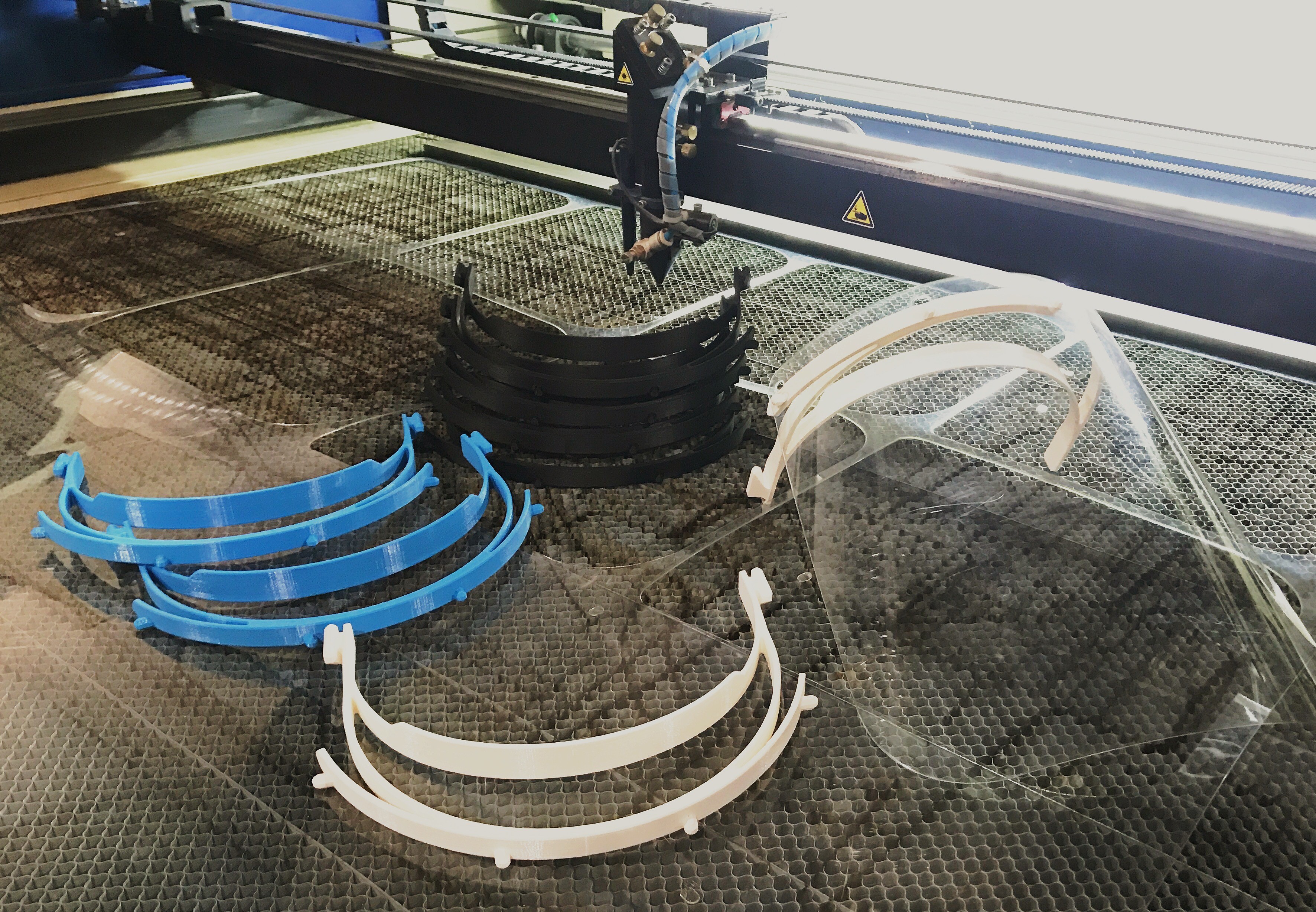 Momentan arbeitet das HRW Team an der Herstellung von 500 Faceshields, die bei der Feuerwehr Gelsenkirchen gebraucht werden. Lasercutter schneiden die Masken aus PET und die 3-D-Drucker sind programmiert, die flexiblen Kopfbänder herzustellen.