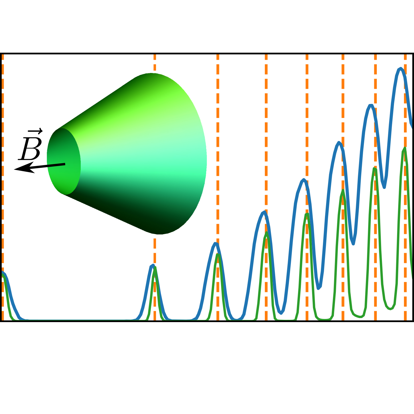 Eine Gruppe von theoretischen Physikern der Universität Regensburg um Prof. Dr. Klaus Richter befasste sich nun mit den besonderen Leitfähigkeitseigenschaften von Nanodrähten mit konischer Geometrie, die aus topologischen Isolatoren bestehen. Ihre Ergebnisse wurden mit dem Prädikat Editors‘ Suggestion versehen im Journal Physical Review Letters veröffentlicht. Unter dem Einfluss von Magnetfeldern zeigen derartige kegelförmige Nanodrähte ihr volles Potential: In Magnetfeldern senkrecht zur Drahtachse leiten sie den Strom entlang der Oberfläche verlustfrei, während sie sich in starken koaxialen Magnetfeldern wie künstliche Atome verhalten, in denen die Elektronen gebunden sind und nur bestimmte diskrete Energieniveaus einnehmen können. Letzteres führt zu einer durch Quanteneffekte bestimmten Leitfähigkeit, die – im Widerspruch zum Ohmschen Gesetz – bei bestimmten charakteristischen Energien maximal wird, wie in untenstehender Abbildung gezeigt.