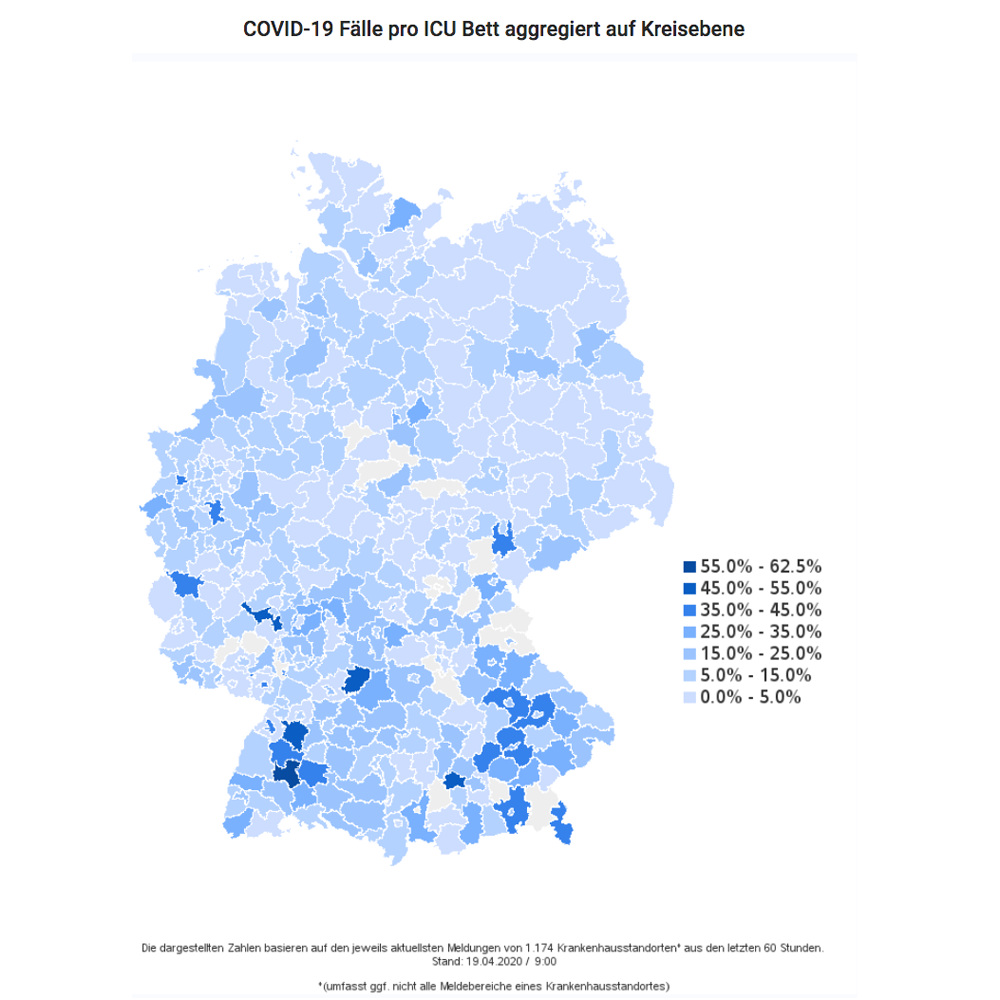 Wichtig war und ist für die Intensivmediziner die Darstellung der Situation für die Umgebung jedes einzelnen Krankenhauses. „‚Worauf muss ich mich einstellen? ‛, ist eine essenzielle Frage in der Pandemiesituation“, so Janssens. „Was bei mir, in meiner Klinik gerade passiert, kann ich überblicken – aber ich muss auch ein Auge darauf haben, was bei meinen Nachbarn und darüber hinaus los ist. Schicken die mir in wenigen Stunden gleich mehrere schwere Fälle? Oder ist es dort eher ruhig?“