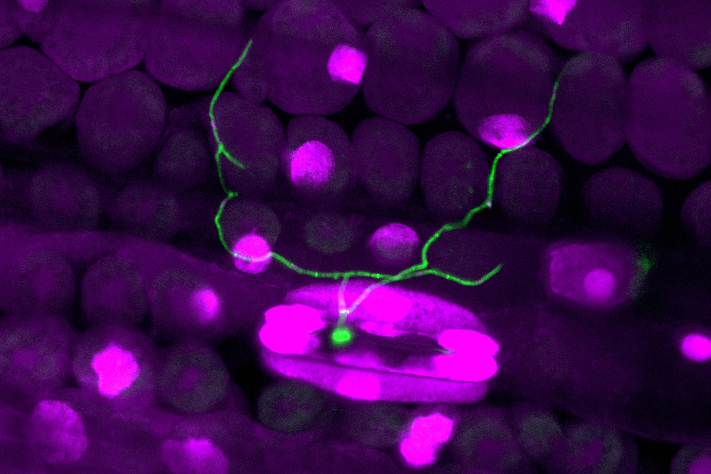 Caption: Fluorescent microscopy picture showing fungal hyphae growing through a wheat stoma in the early phase of infection.